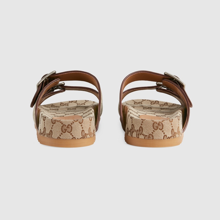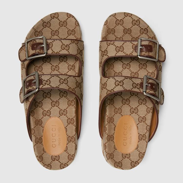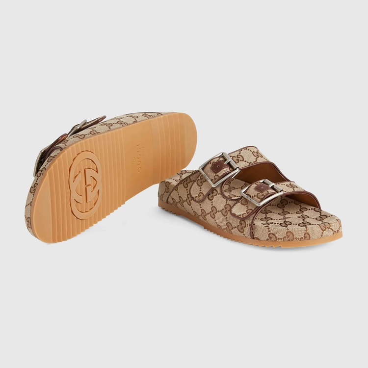 Style 658020 2HK60 9791 A pair of flat sandals Crafted from monogram canvas in beige and ebony. First used in The 1970s, The GG logo was an evolution of The original Gucci rhombi design from The 1930s, and from then it’s been an established symbol of Gucci’s heritage.