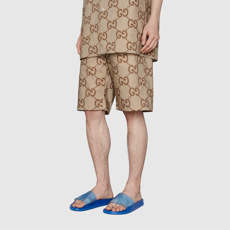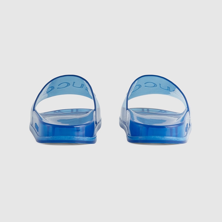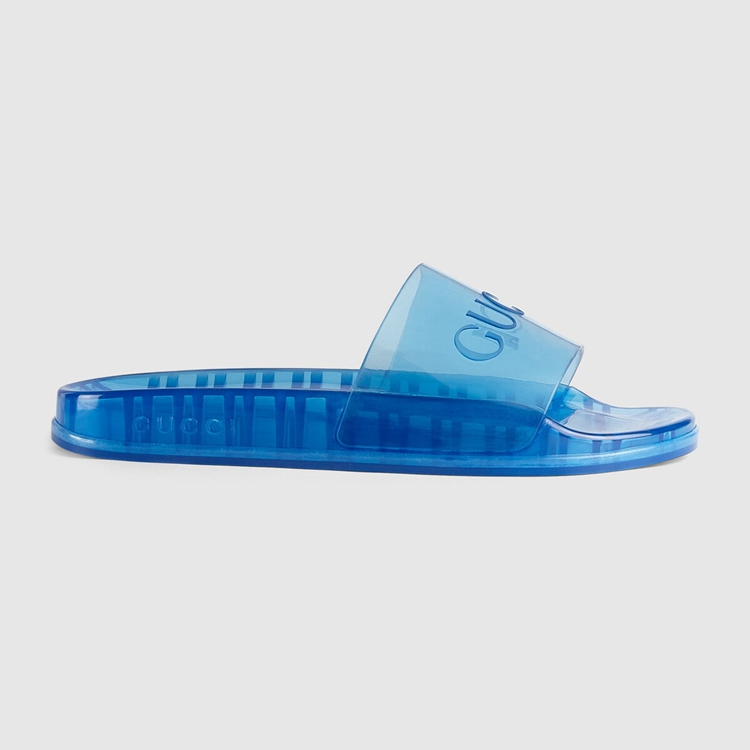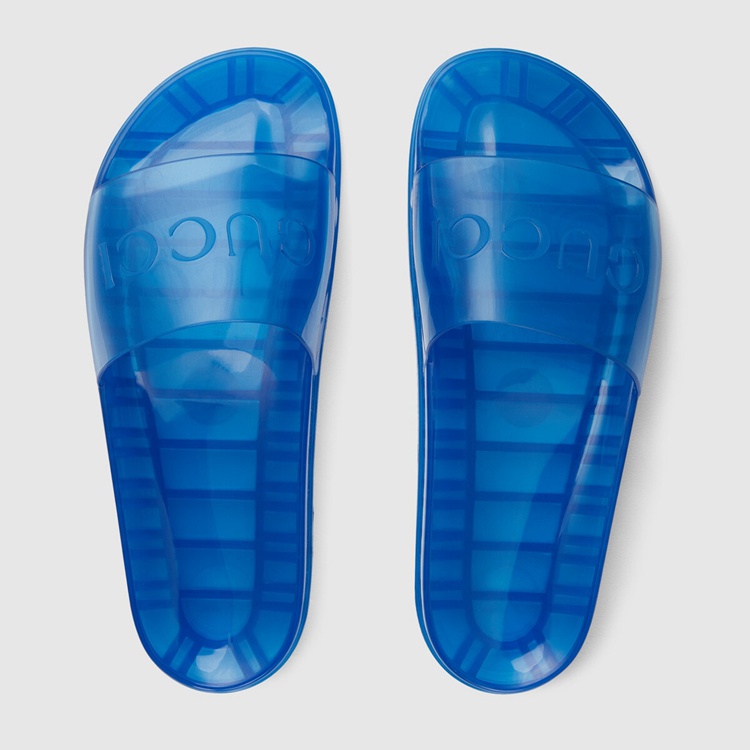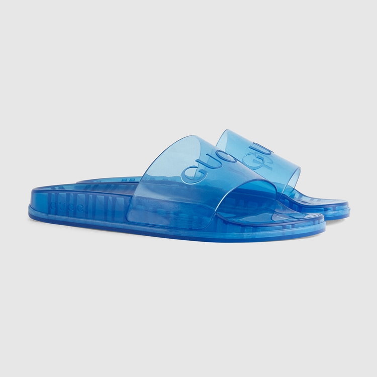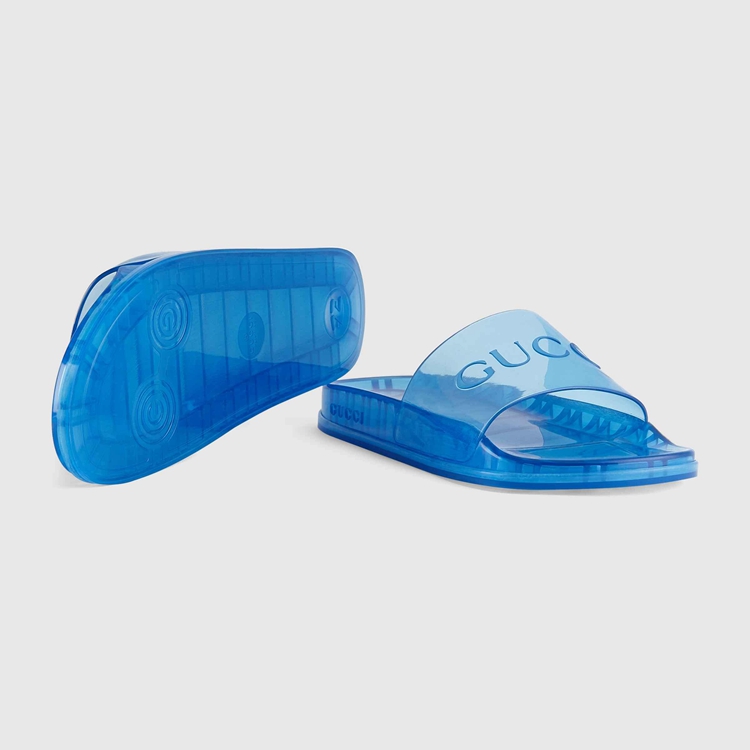 Style 674163 J8700 8759 With a distinct ’90s feel, These slide sandals are presented in transparent blue rubber. Reminiscent of The logo trends of The era, The shoe is completed by The name of The House.
