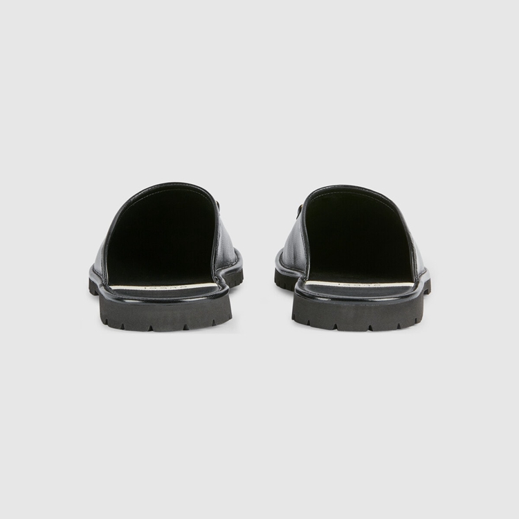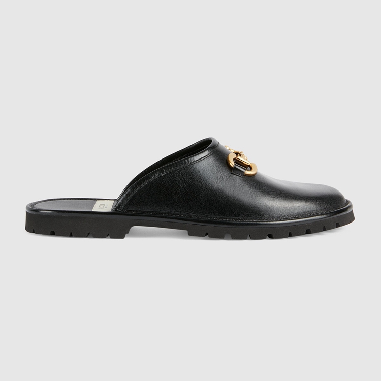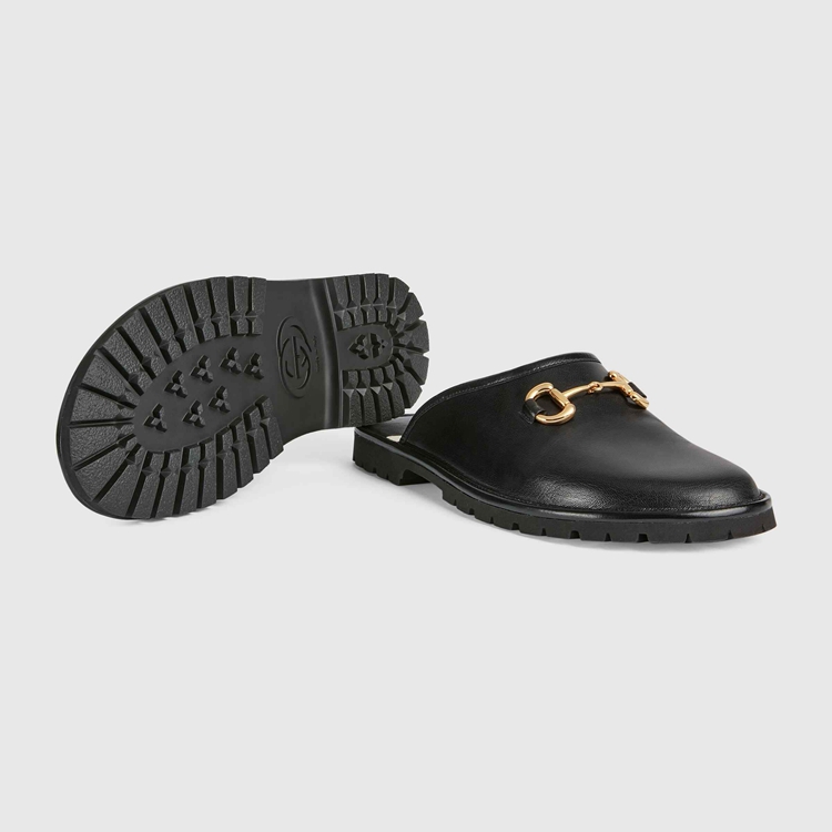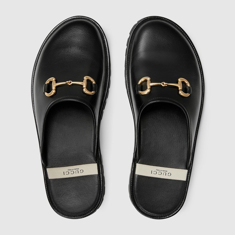 Style 657954 0G0V0 1000 A play on The Classic house slipper, This slip on shoe is Crafted from black leather and enriched With The House’s Emblematic Horsebit hardware. Hybrid Designs challenge The concept between inner wear and outwear throughout The latest collections.