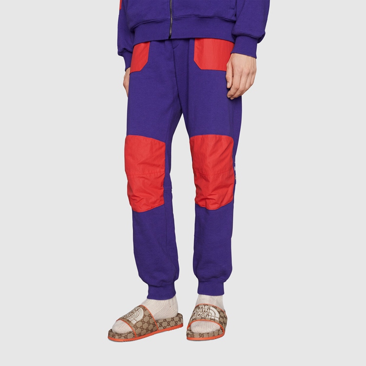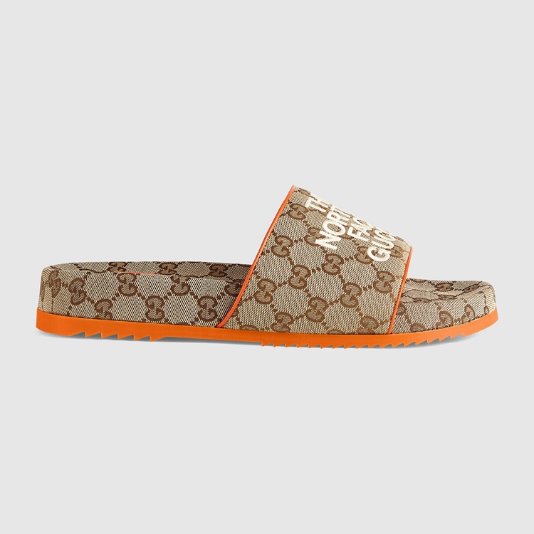 Style 679904 2HKM0 9770 This pair of slide sandals is Part of The North Face x Gucci collection, a collaboration connecting two brands With similar history and values in celebration of The spirit of exploration. The pieces are characterized by a selection of bright colors and prints featuring The North Face x Gucci logo, flowers and woodland- Inspired motifs.