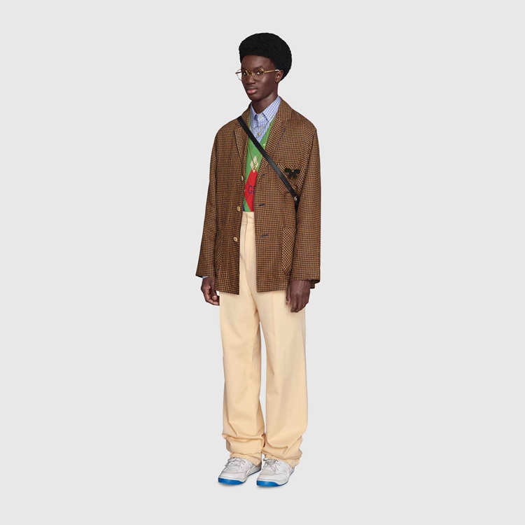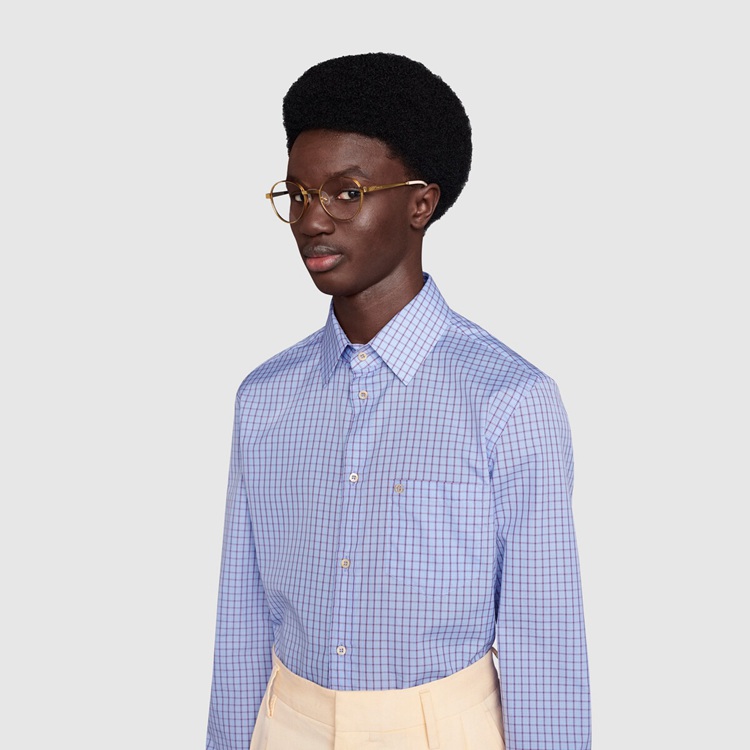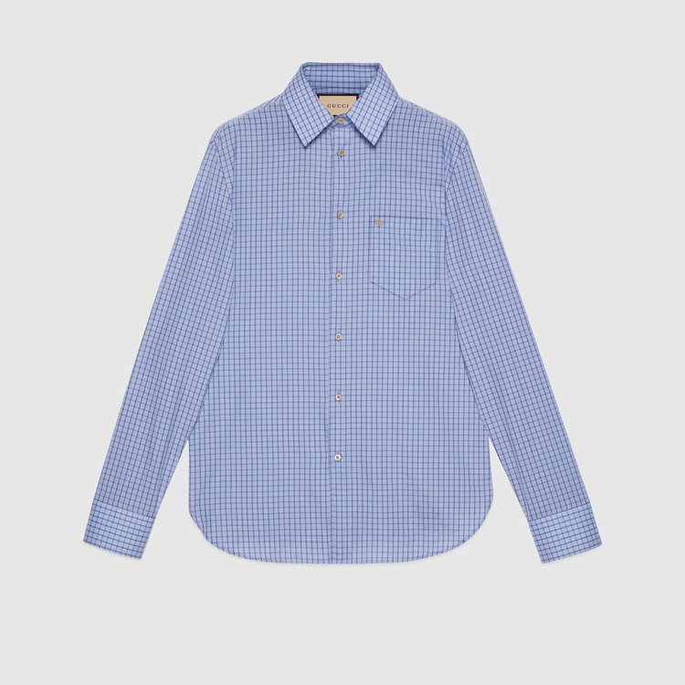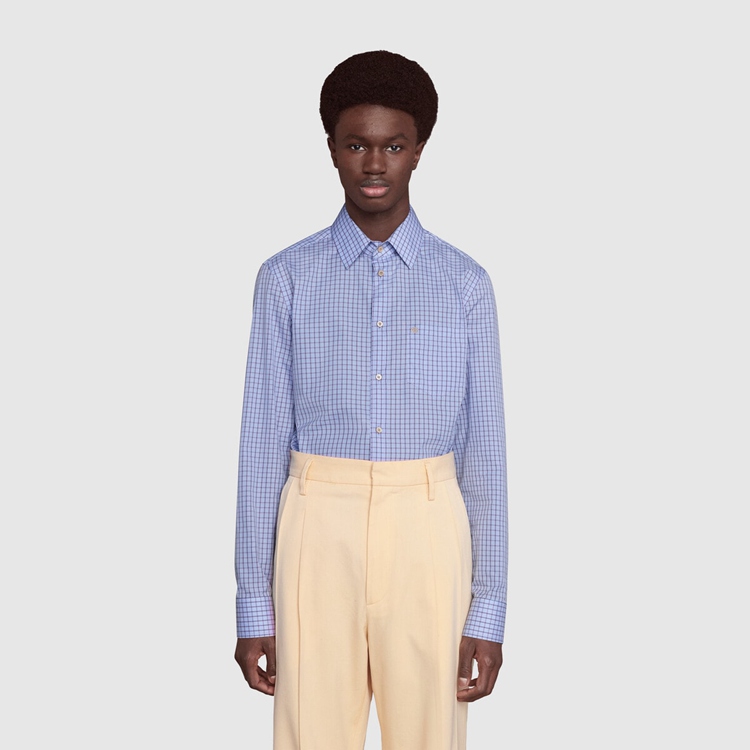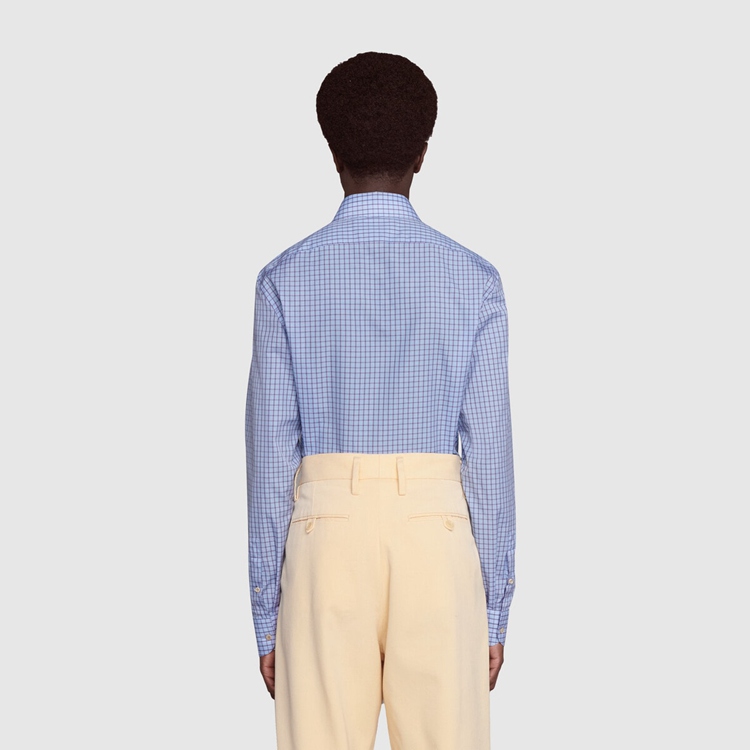 Style 654926 ZAG0P 4311 The distinctive Double G, originally Inspired by a belt buckle from The 1970s, forms a delicate embroidered detail atop This mini check cotton tailored shirt With long sleeves—elevating The material’s rustic origins.