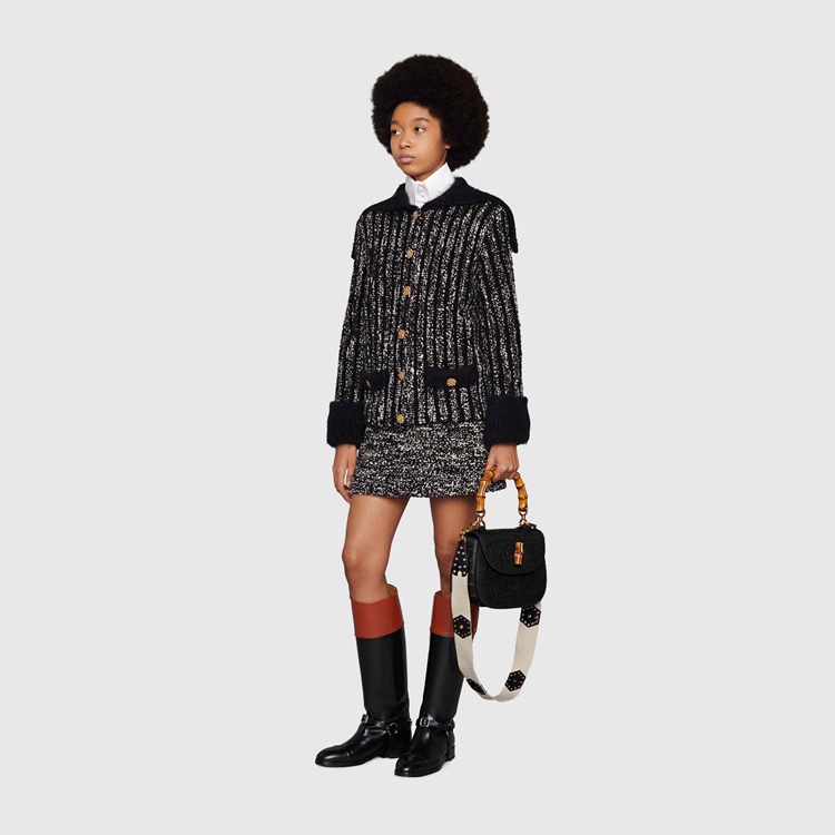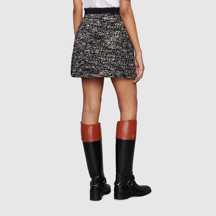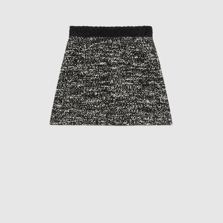 Style 678914 XKB6S 1043 For Gucci Aria, The Creative Director revisits traditional silhouette and fabrics through a contemporary lens. This wool mohair skirt takes on The theme thanks to The contrasting Color blend and an A-line shape.