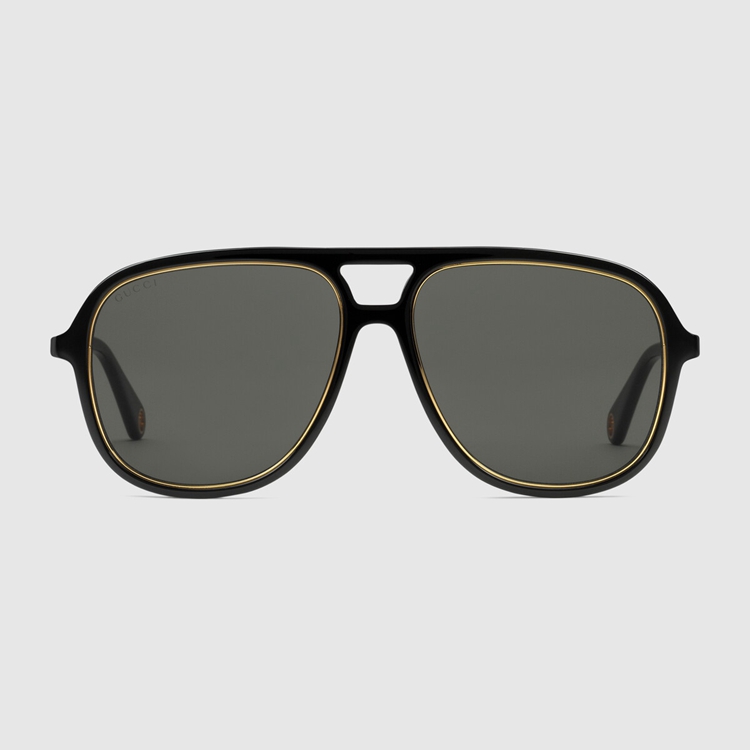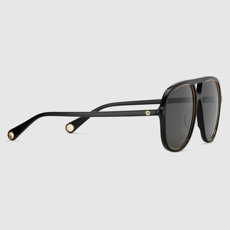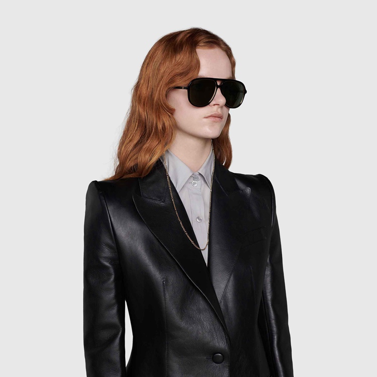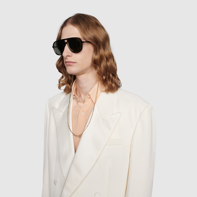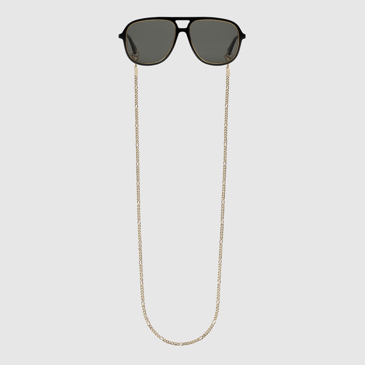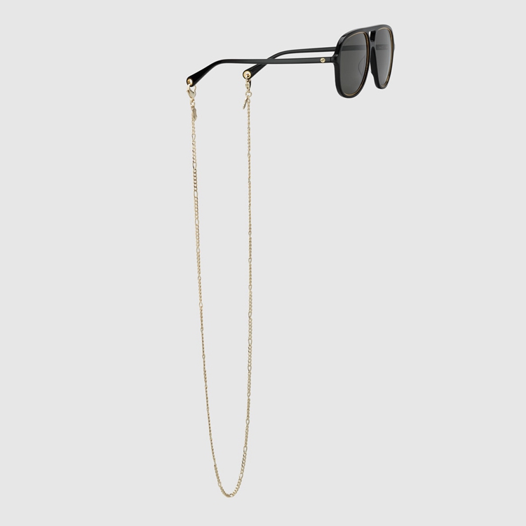 Style 691294 J0741 8012 The gold-metal chain is The defining element of These navigator-frame sunglasses, Crafted from shiny black acetate With a contrasting rim. The Interlocking G, an emblem of The House logo, appears as a detail on The temples, enhancing The style’s Retro mood.