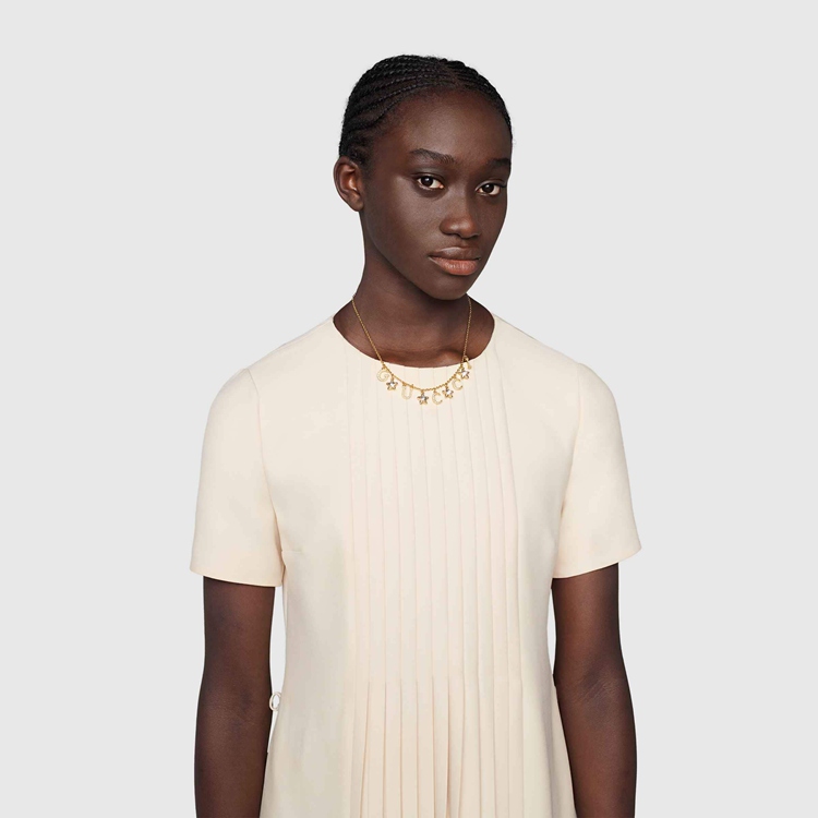 Style 679044 J1D50 8031 This necklace With a gold finish and adjustable clasp closure is characterized by The Gucci script detail. The charms are enriched With sparkling crystals and interspersed With stars For a fun and whimsical effect.