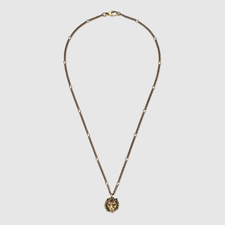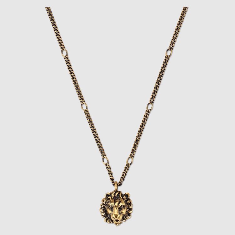 Style 410673 I4600 8233 The lion head design features This pendant necklace made in metal With an aged gold finish.
