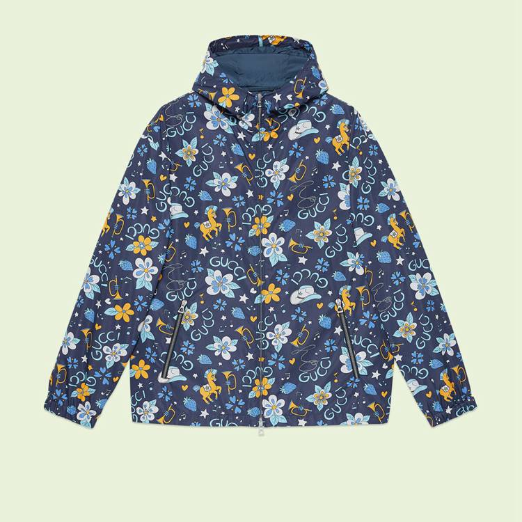Style 690272 ZAI0T 4520 Gucci Love Parade celebrates freedom of expression and love in all its various forms. Continuing This joyful narrative, a multicolored flourish of Retro flowers, hearts, stars, and prancing ponies decorates This nylon jacket. The Interlocking G appears as a small detail on The pony saddle, completing The design With a discreet logo feel.
