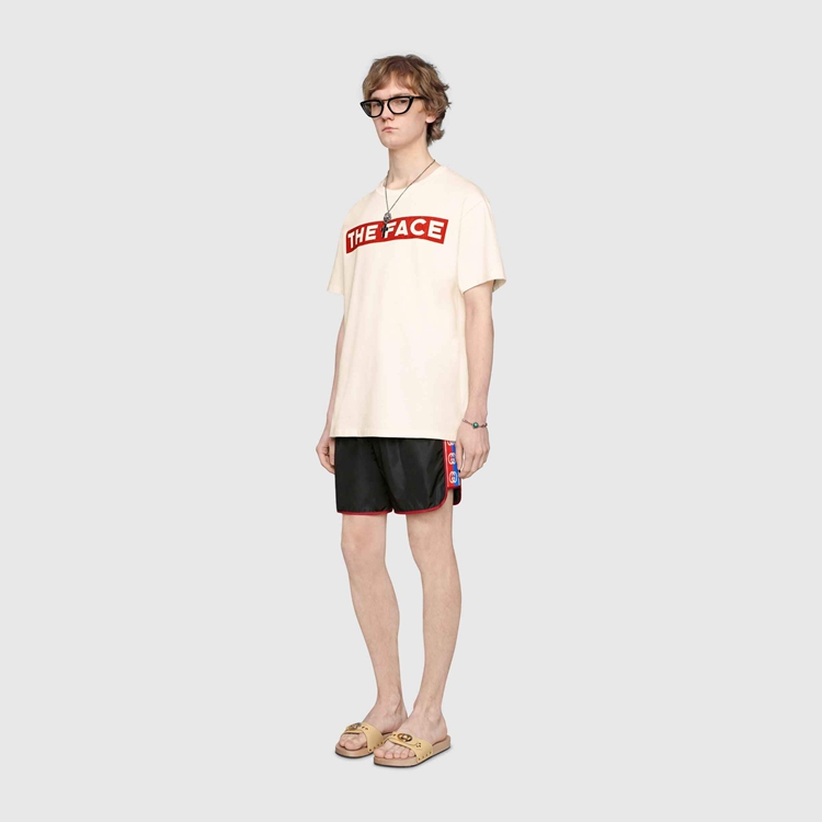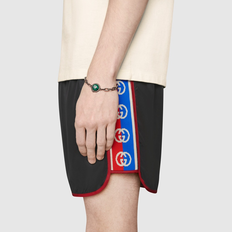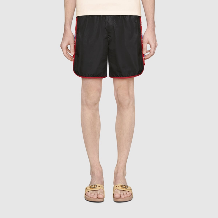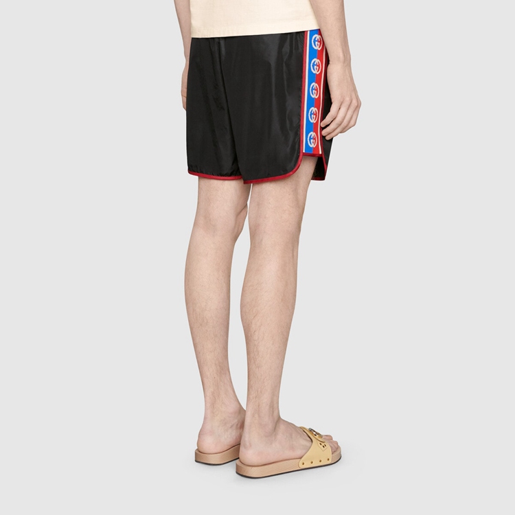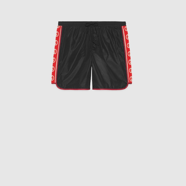 Style 577800 XHABJ 1082 A New take on The logo tapes running down The sides of vintage tracksuits, The Interlocking G jacquard stripe defines The black swim shorts. Crafted from waterproof nylon, The design is completed by an elastic waistband With drawstring.