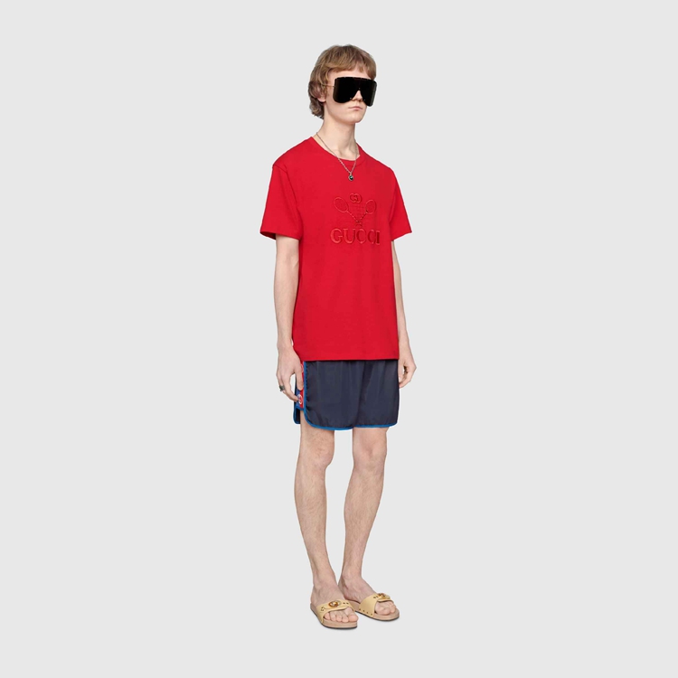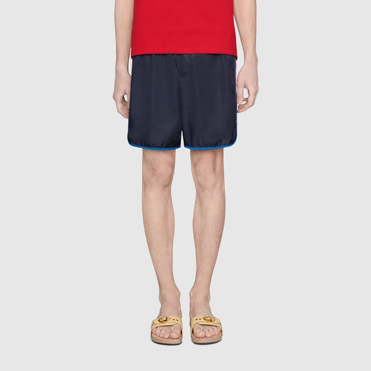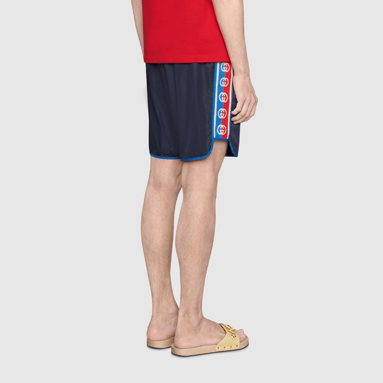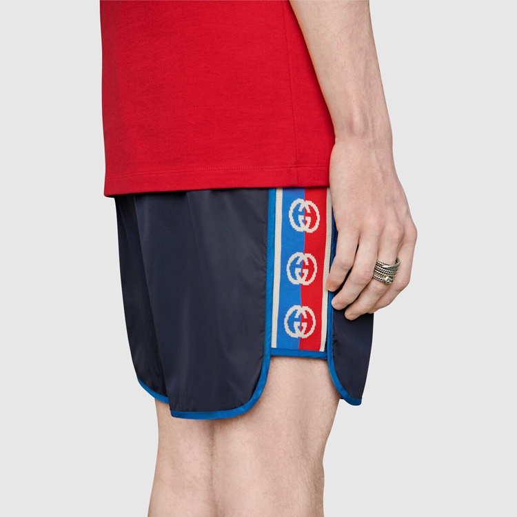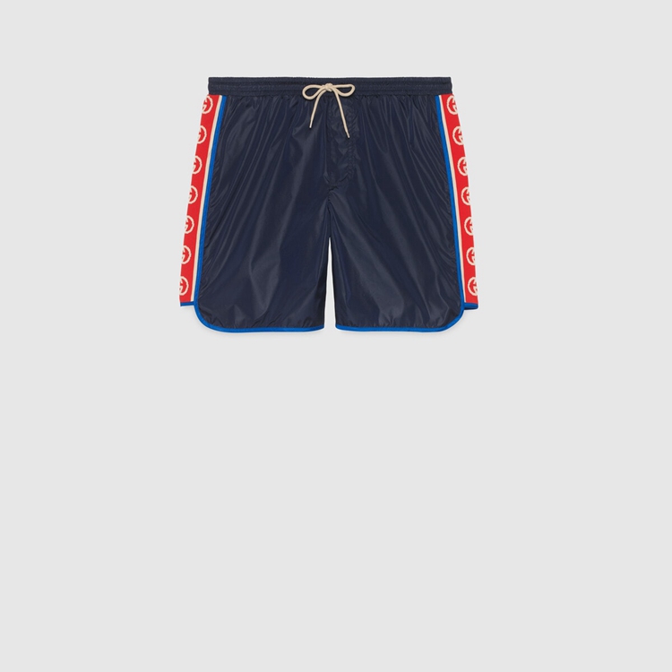 Style 577800 XHABJ 4487 A New take on The logo tapes running down The sides of vintage tracksuits, The Interlocking G jacquard stripe defines The deep blue swim shorts. Crafted from waterproof nylon, The design is completed by an elastic waistband With drawstring.