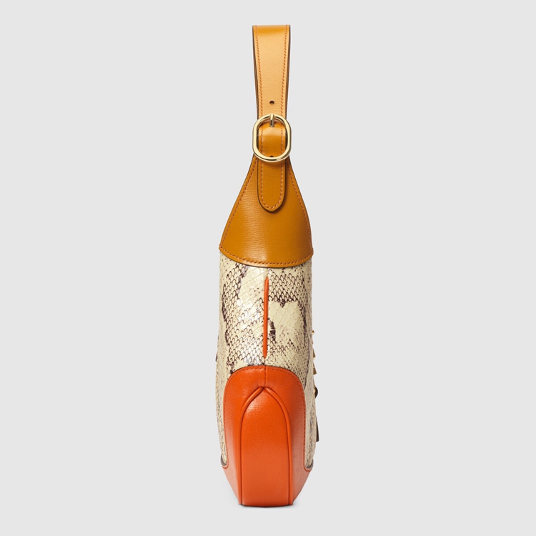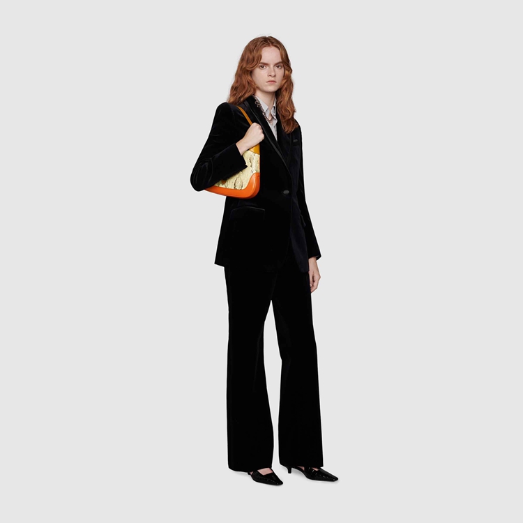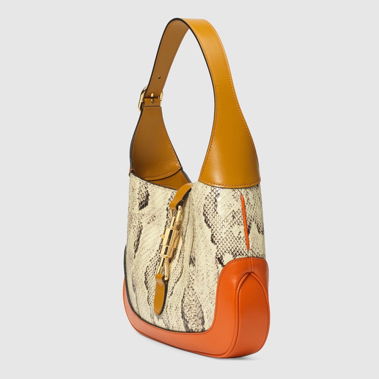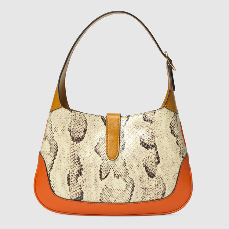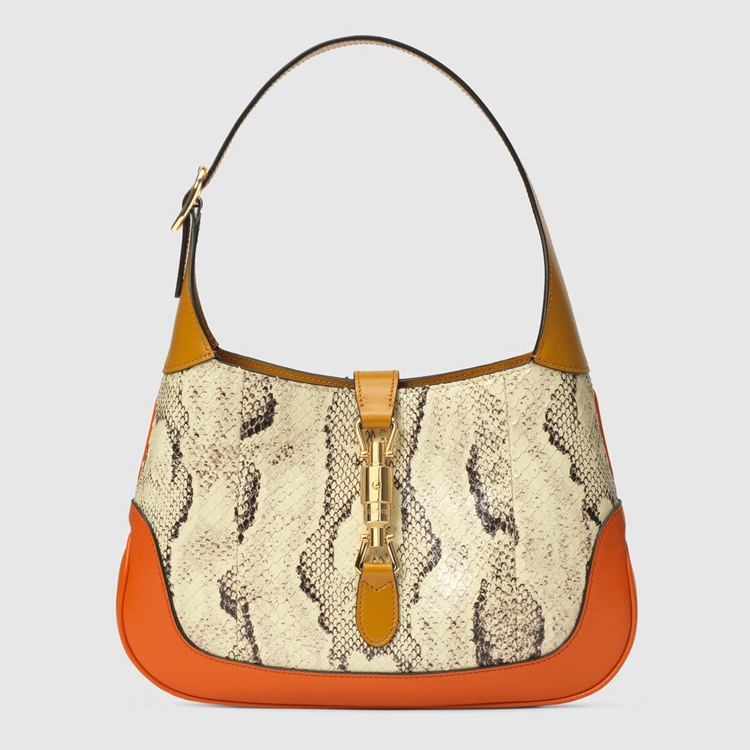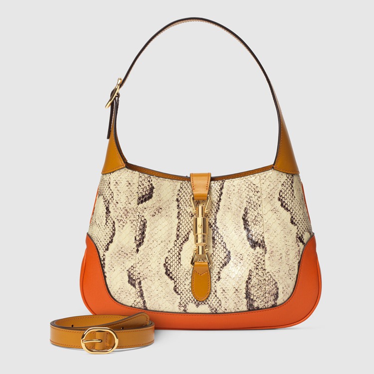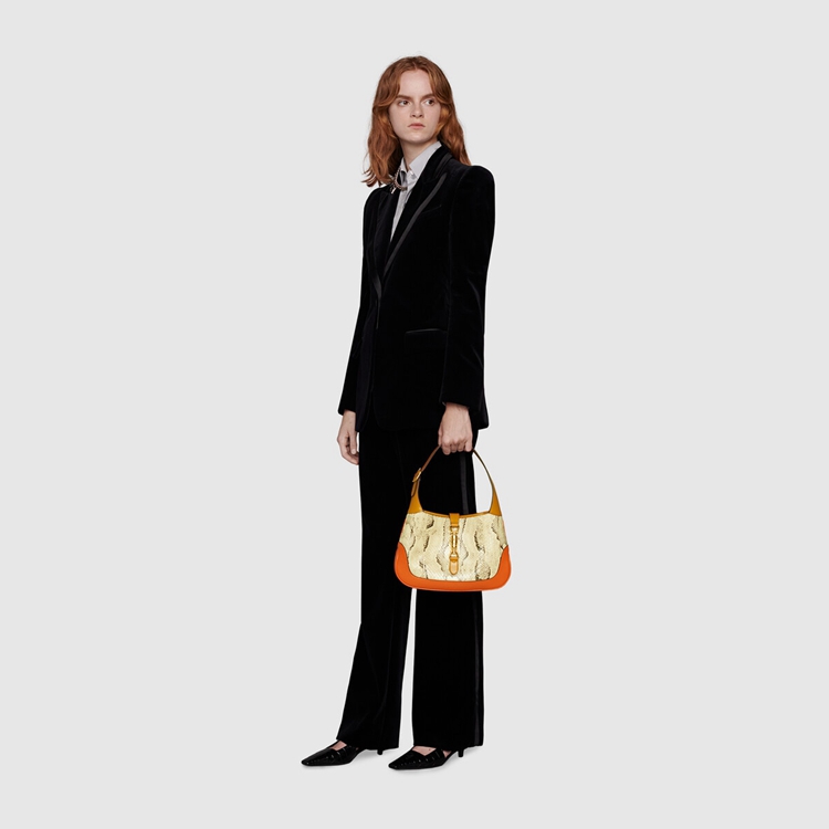 Style 636706 L4PMP 9673 The Aria collection delves into The archives, presenting Designs rich With vintage- Inspired details and references to The House’s heritage. Brought back to The forefront, The Jackie 1961’s recognizable shape is presented in anaconda and colorful orange leather. Attached to The bag With a buckle closure, The second strap adds a contemporary feel to The iconic style, providing New ways to wear—from top handle, shoulder to cross body.