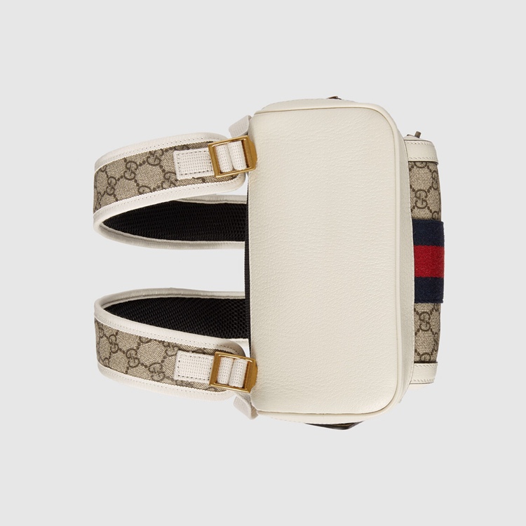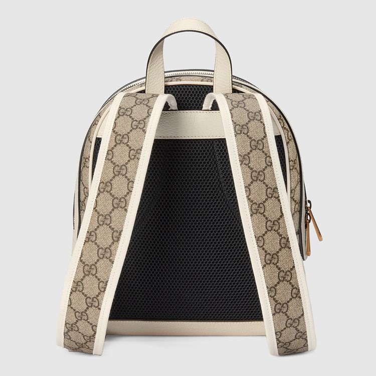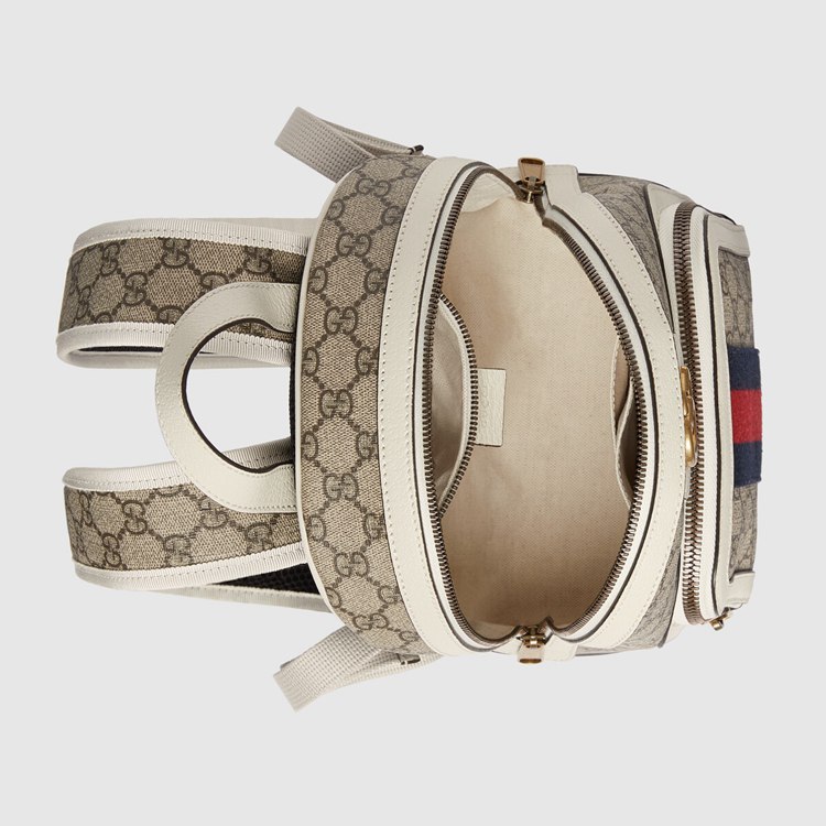 Style 685769 9U8BT 9760 Within Gucci Aria The world of Ophidia evolves With New iterations, combining vintage Inspired details With Emblematic House codes. First developed by Gucci in The 1950s, The Web stripe pays homage to The House’s roots. Appearing here in blue and red, The stripe runs down The center of This beige and ebony GG Supreme canvas backpack, enriched by a white leather trim.