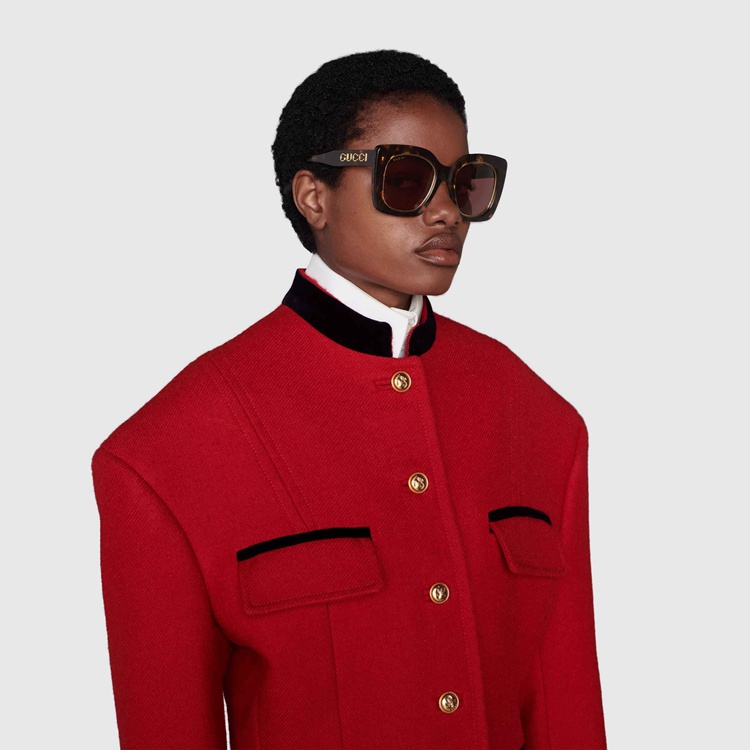 - Shiny dark tortoiseshell acetate With bold Gucci lettering