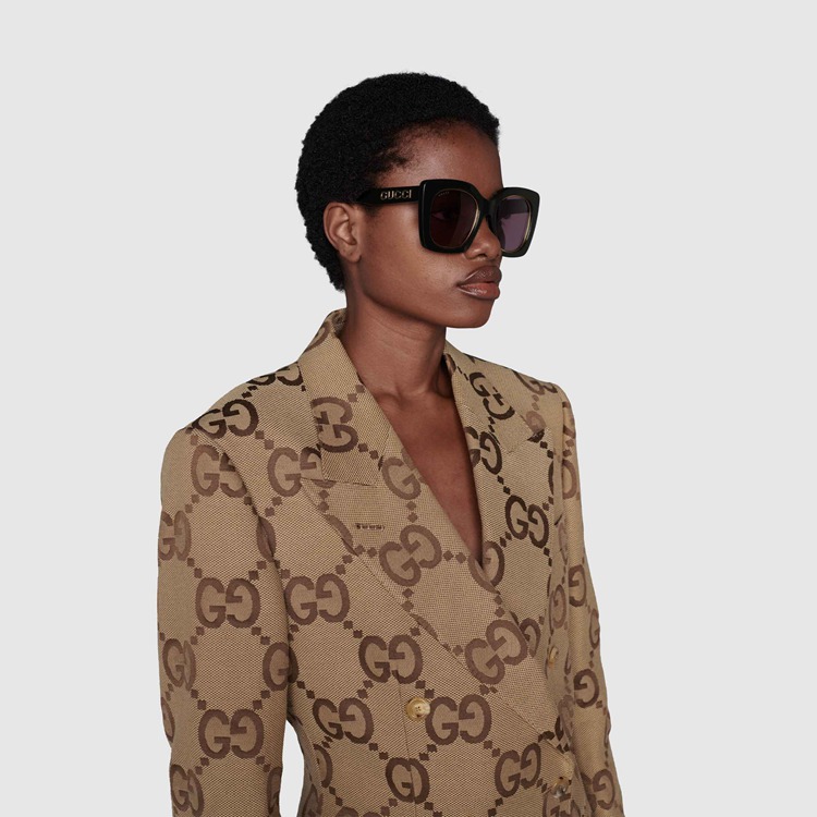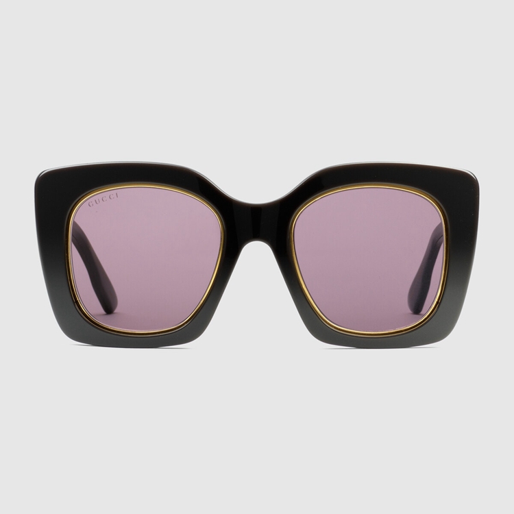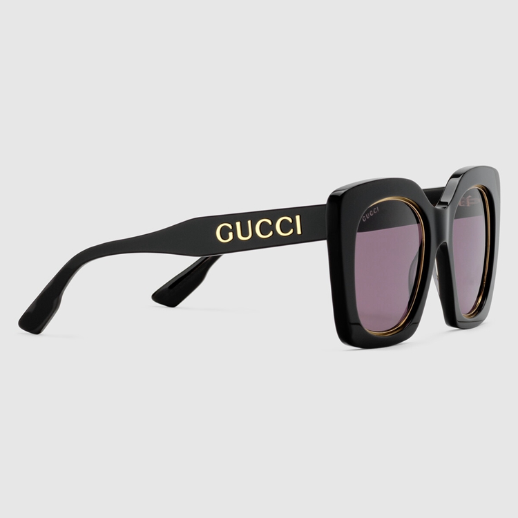 Style 691318 J0740 1250 The name of The House appears as a bold, gold-toned metal detail along The temples, imbuing This pair of sunglasses With a distinctive logo feel. The butterfly-shaped silhouette is Crafted from shiny dark grey acetate With a contrasting metal rim, while a violet lens completes The style.