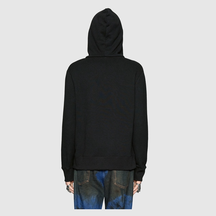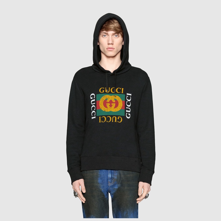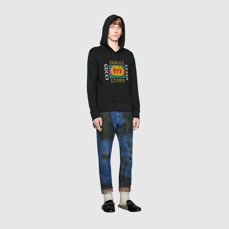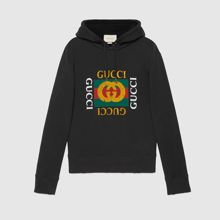 Style 454585 X5J57 1015Alessandro Michele updates The Gucci vintage logo in an unexpected way, Inspired by vintage prints from The eighties. Presented on The front of an oversize felted cotton jersey hoodie, treated For a distressed effect.