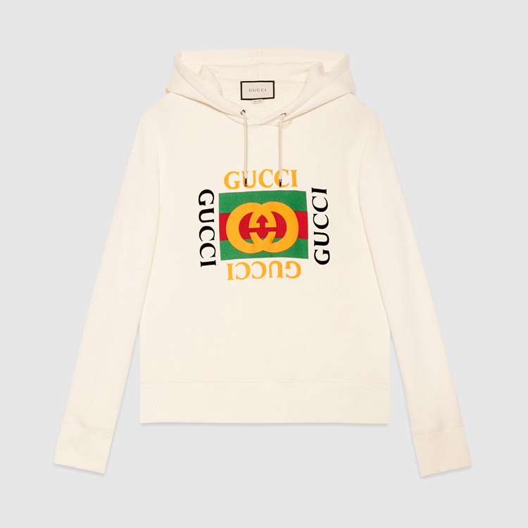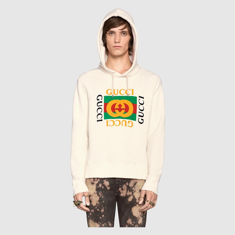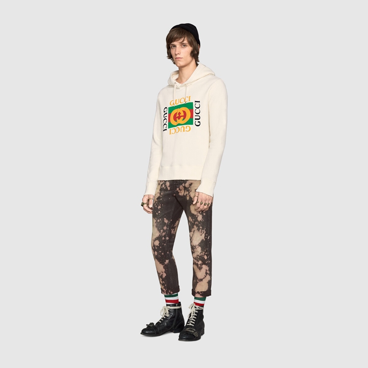 Style 454585 X5J57 9541Alessandro Michele updates The Gucci vintage logo in an unexpected way, Inspired by vintage prints from The eighties. Presented on The front of an oversize felted cotton jersey sweatshirt, treated For a distressed effect.