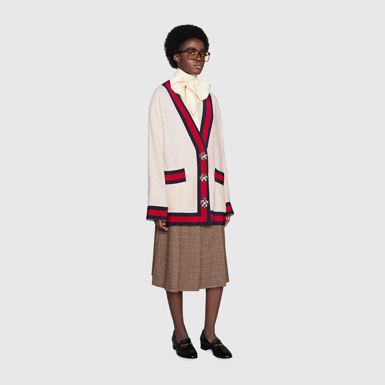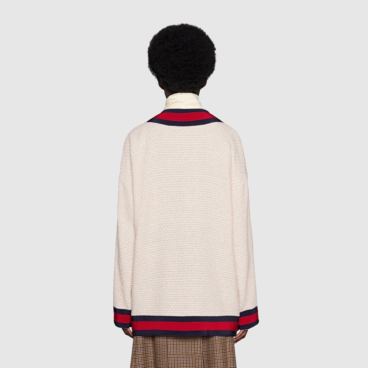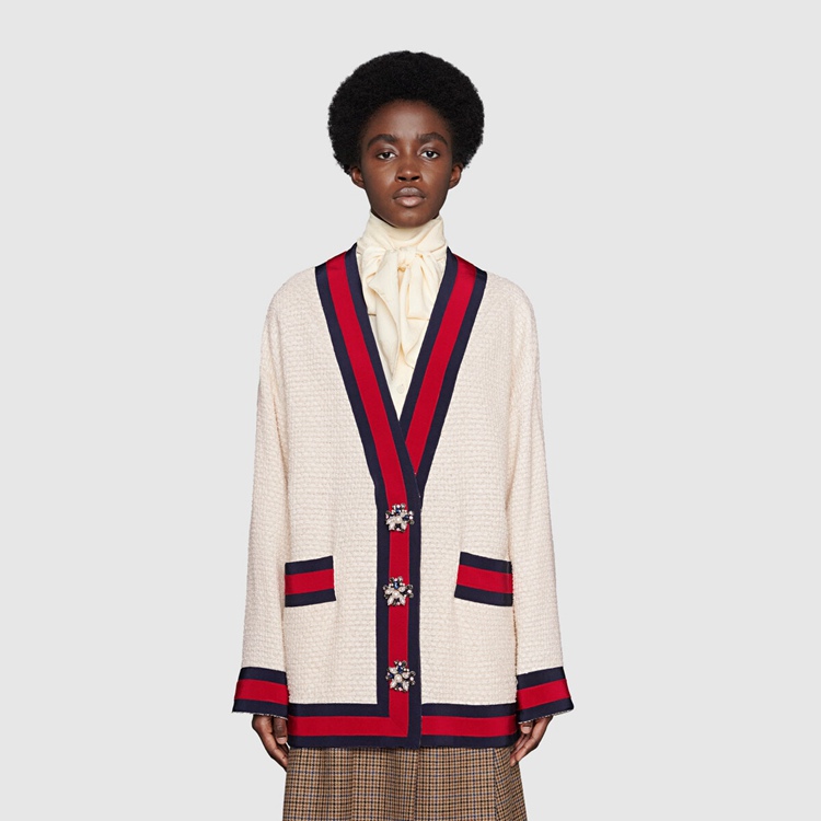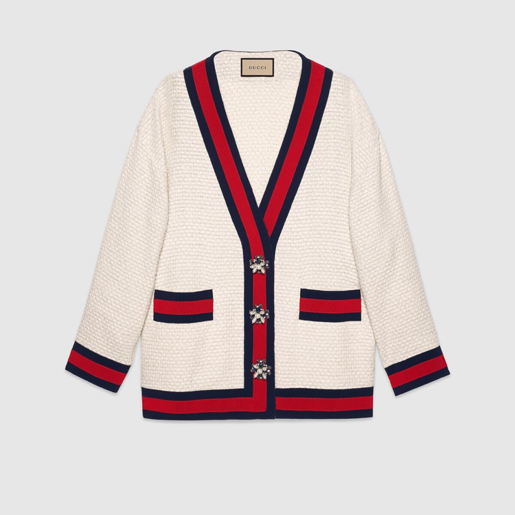 Style 469657 ZID86 9401An oversize cardigan jacket With a deep V-neckline. The jeweled buttons are composed of crystals and glass pearls. Made in an unlined light soft tweed.