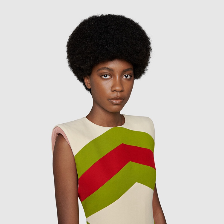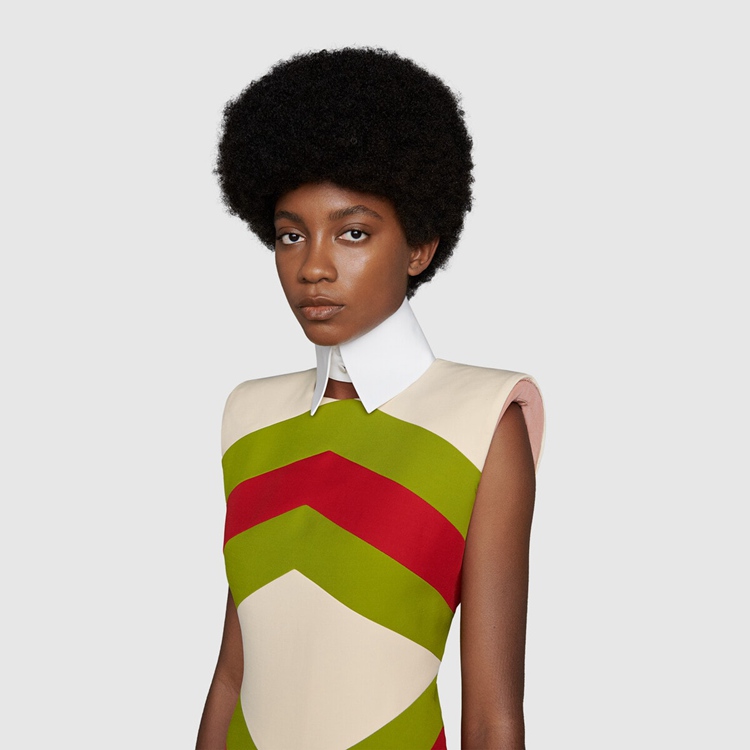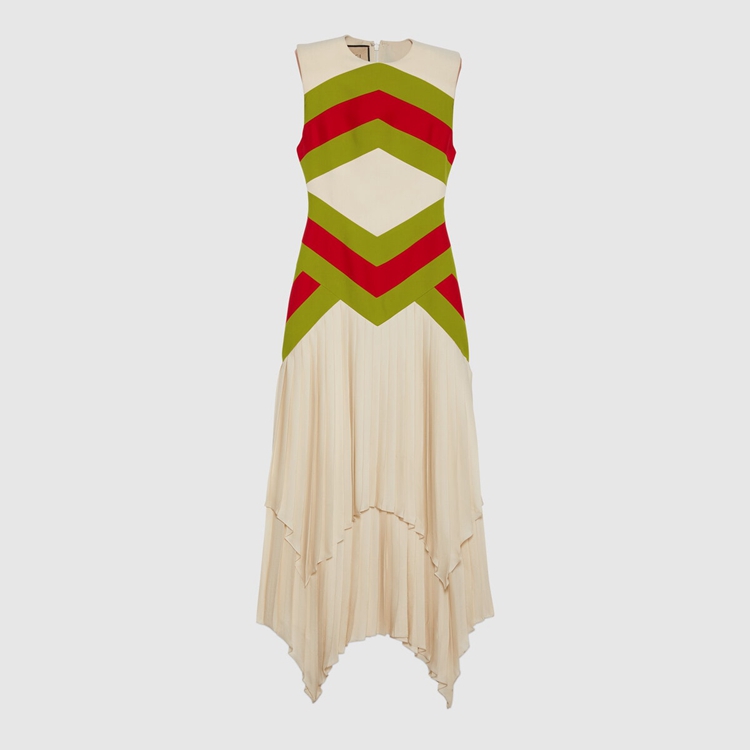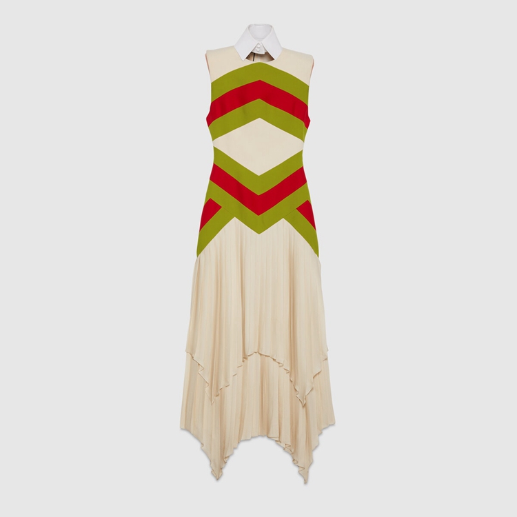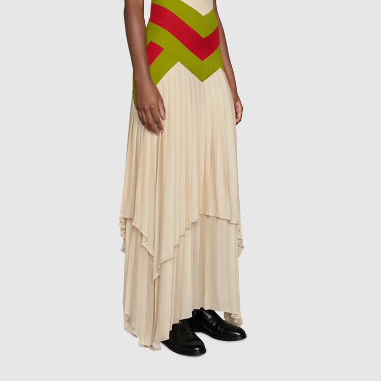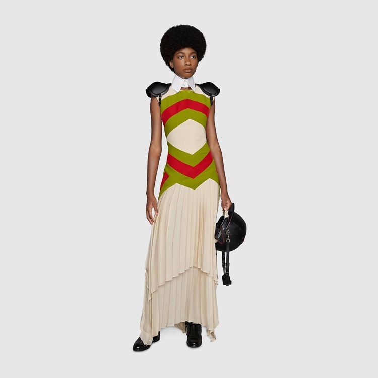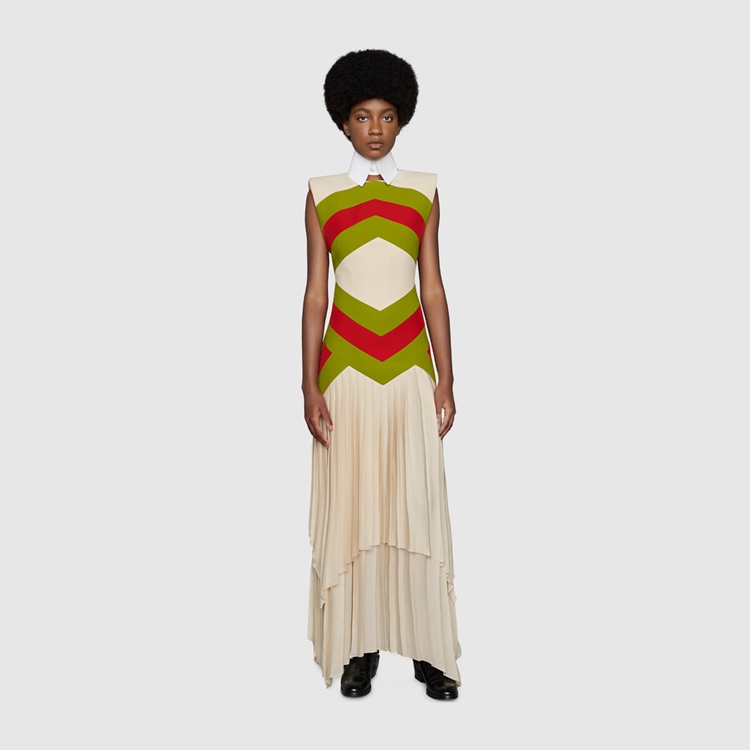 Style 669260 ZAH0J 9782Details taken from The archive continue to be incorporated into The collections With contemporary take. The chevron vintage Web appears on The front of This dress, Recalling The sportswear influences that run through The House’s narrative, while The pleated layers of The bottom Part add a refined touch. The style is completed by padded shoulders.