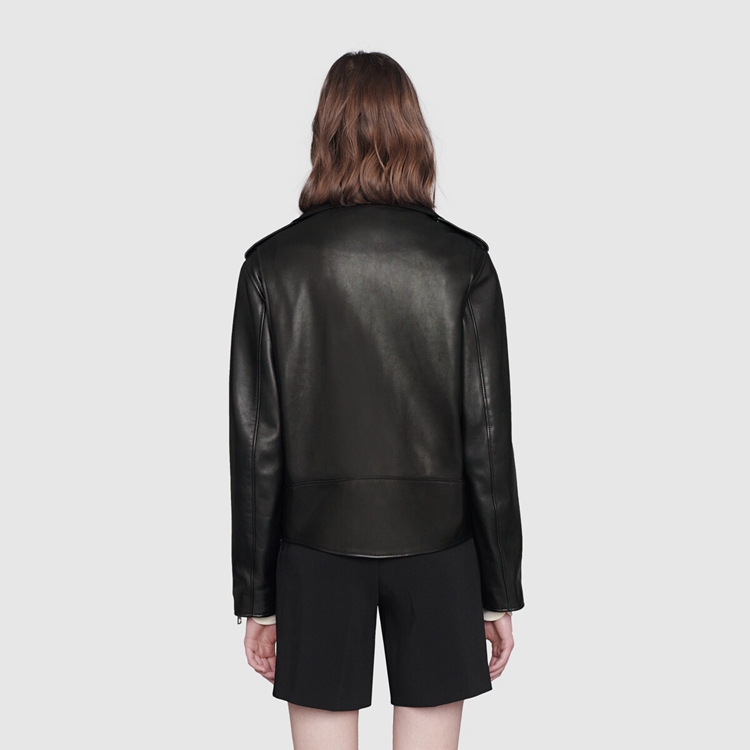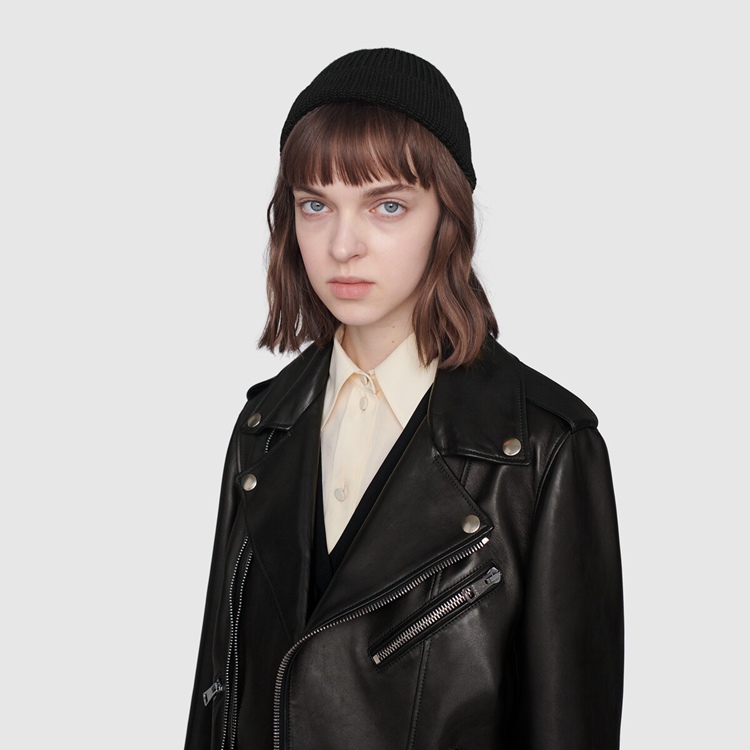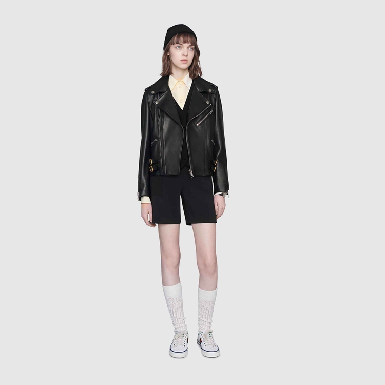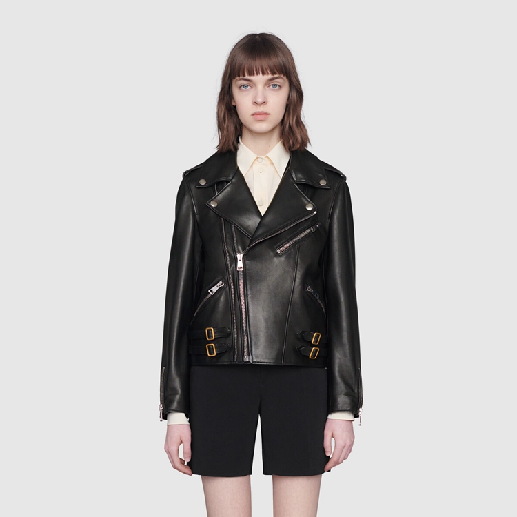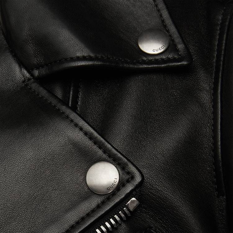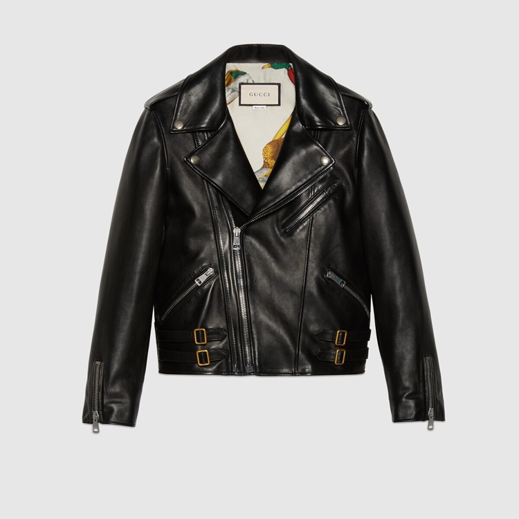 Style 629189 XN336 1000 A cult ready-to-wear piece, The biker jacket is presented in black smooth leather With a shiny finish, enhanced by buckle strap and zip details, and aged gold-toned hardware. A print Inspired by vintage silk scarfs, depicting a lake scene, decorates The lining and makes For a refined, hidden detail.
