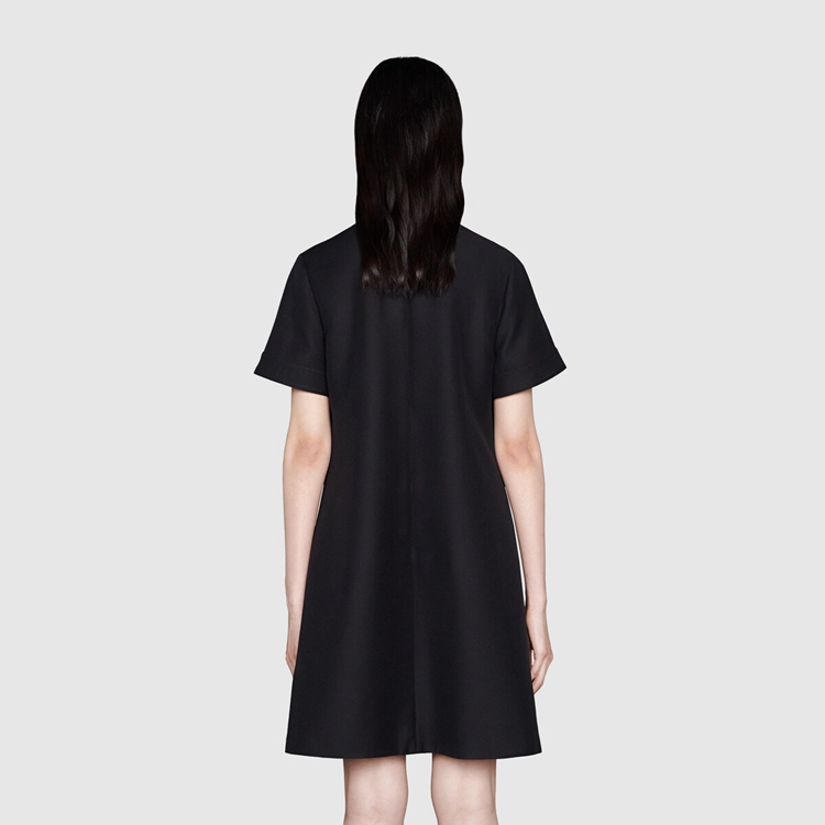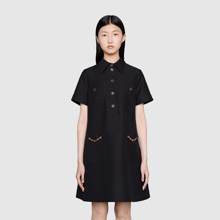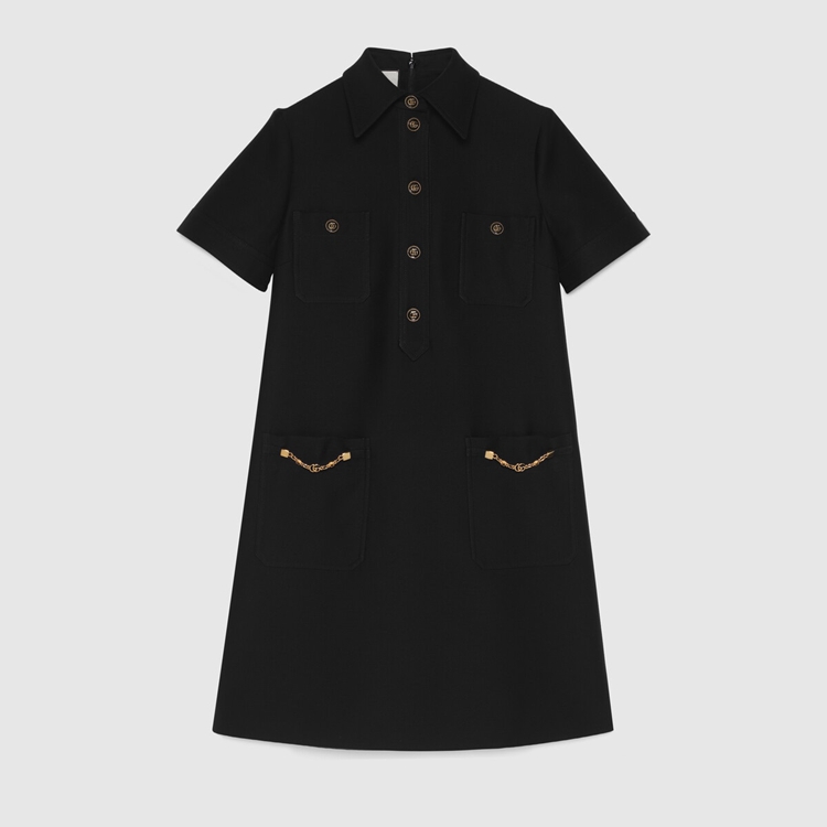 Style 661672 ZAD88 1000In looking to a future of fashion With no beginning or end, The Ouverture collection finds inspiration in elements from other eras. These motifs take The form of reimagined House codes, their shapes compelling New perspectives. Here, This polo dress is Crafted from cady crêpe wool silk blend and defined by a decorative gold-toned chain With Double G at The pockets.