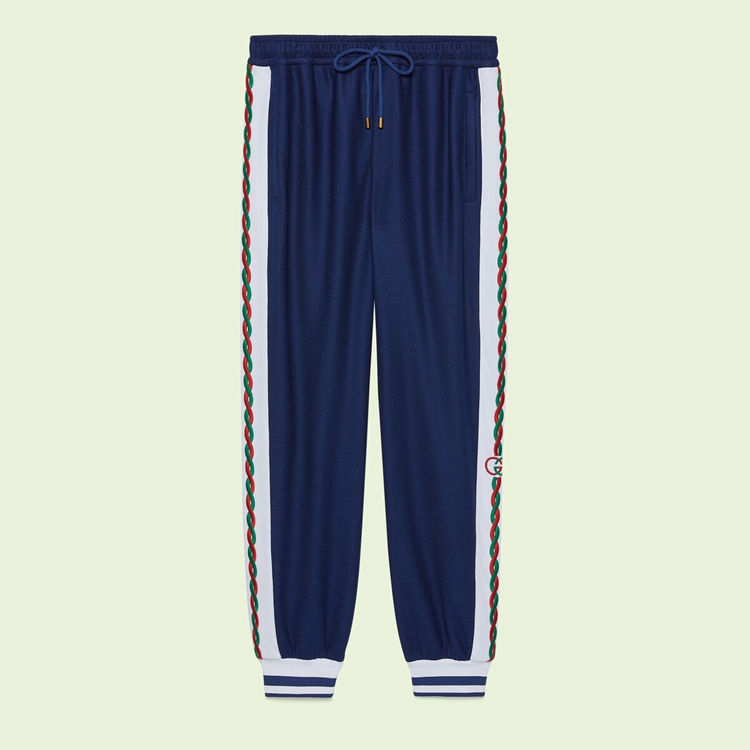Style 692778 XJD7N 4622 The Classic red and green Color combination was originally Inspired by The chromatic range of fox-hunting jackets popular in The United Kingdom. To This day The same Color combination continues to act as a code of membership and identification and has evolved year after year. For Gucci Love Parade, The stripe is presented as a braided detail and is paired With The Interlocking G detail on This dark blue polyester piquet jogging pant.