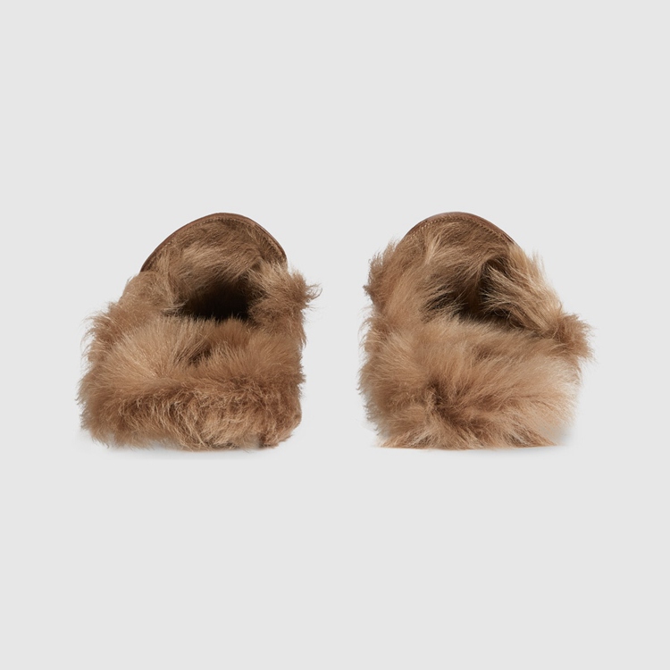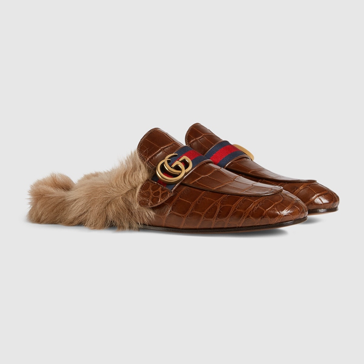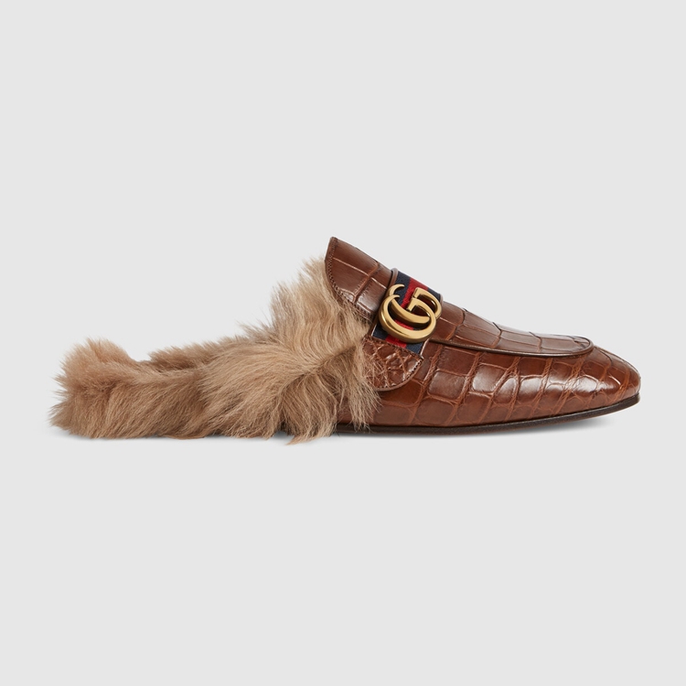 Style 469950 EC2G0 2561 The Princetown fur-lined leather slipper is completed With a leather strap across The front With House Web stripe and Double G hardware. Since its debut in The Fall Winter 2015 collection, The Princetown slipper has become a mainstay of Gucci collections. Unconventional yet entirely modern, The influential accessory from Creative Director Alessandro Michele’s aesthetic vision is a contemporary interpretation of The Horsebit loafer.
