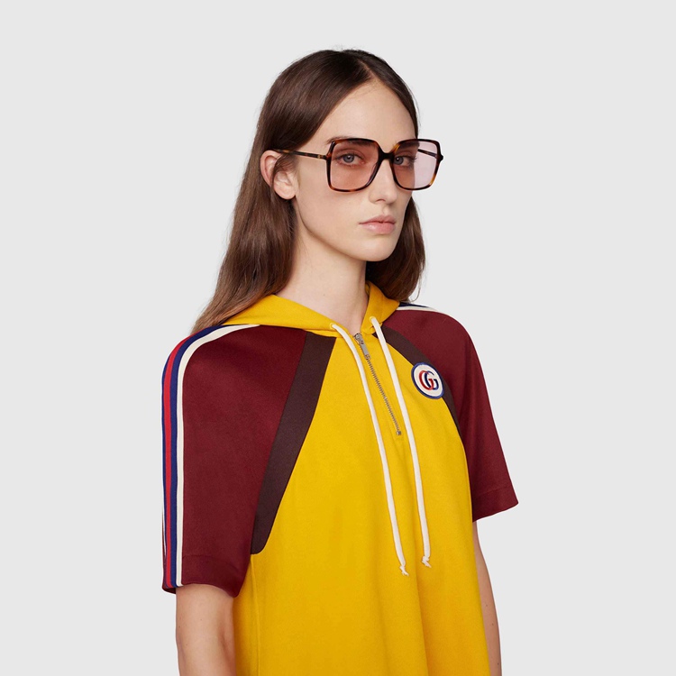 Style 683574 J0748 2369 These rectangular-shaped acetate sunglasses channel The collection’s ’70s influences, enriched further by The Interlocking G on The temples For a subtle logo feel. The style is characterized by a photochromic lens that turns from pink to burgundy when exposed to light, while The blue light filter helps protect The eyes.