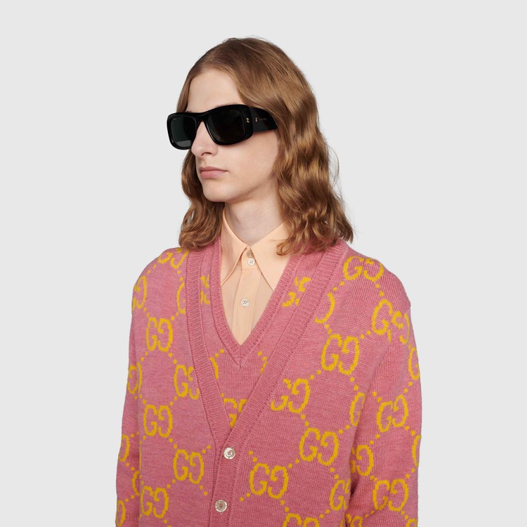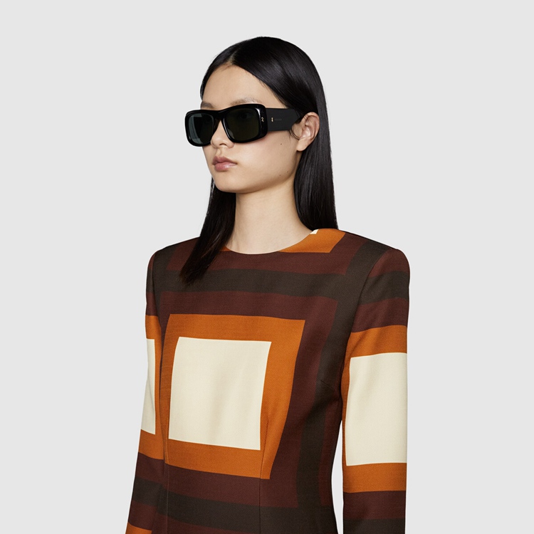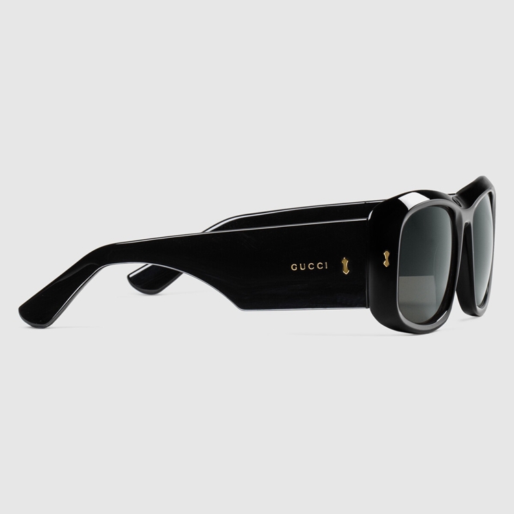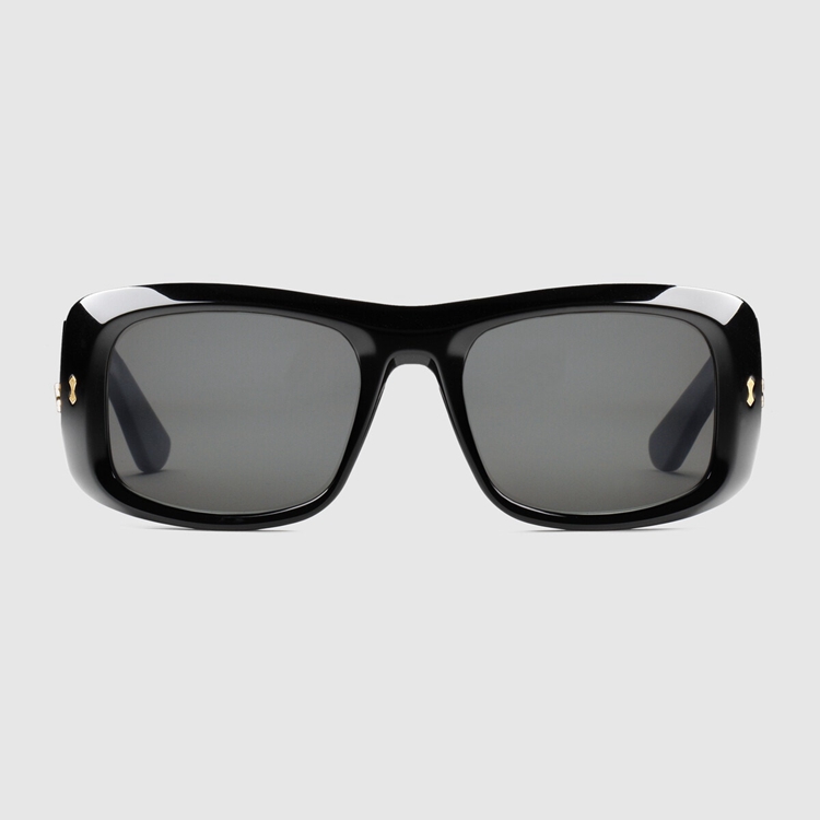 Style 691347 J0740 1012Characterized by thick black acetate frames, This pair of rectangular sunglasses have a ’90s feel. The wide temples are decorated With Gucci rivets and The name of The House appears as delicate engraved lettering.