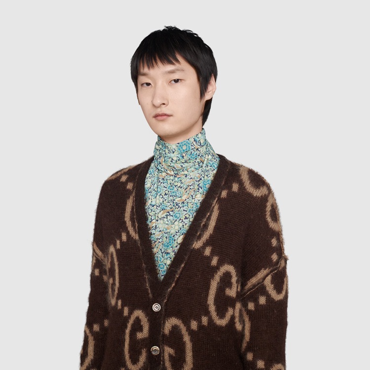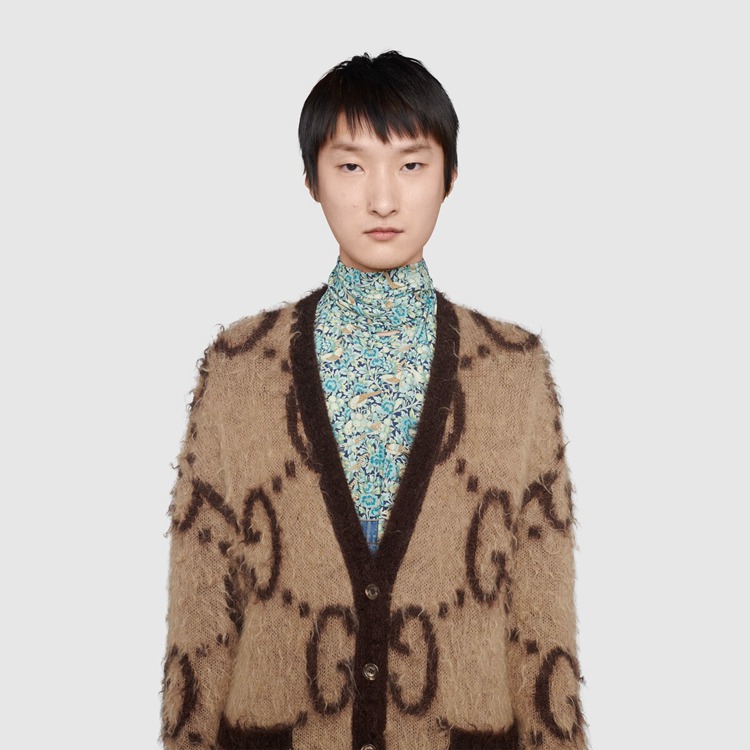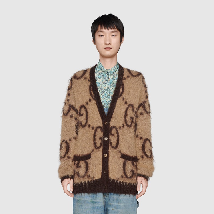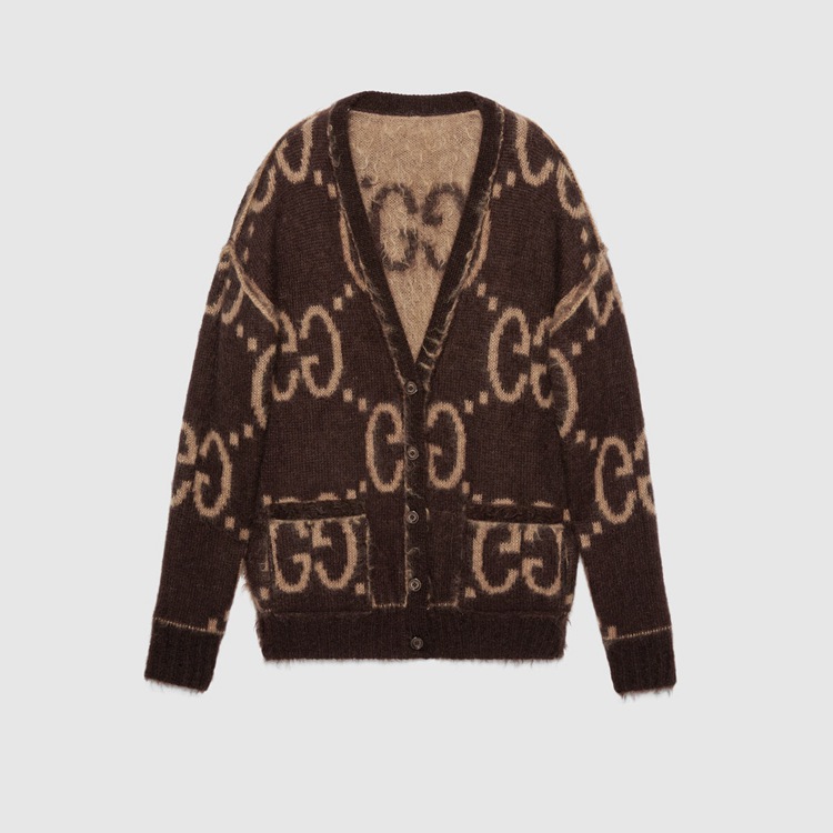 Style 635160 XKBK2 2254 Crafted from brushed wool mohair, The jacquard cardigan features an allover macro GG pattern on both sides, in reverse colors. An established symbol of Gucci’s heritage, The GG logo is continually incorporated into collections in New ways With modern iterations that play With dimension, styling and design. Pieces With versatile ways to wear and style embrace each person who is Part of The House’s individual spirit.