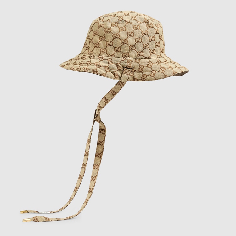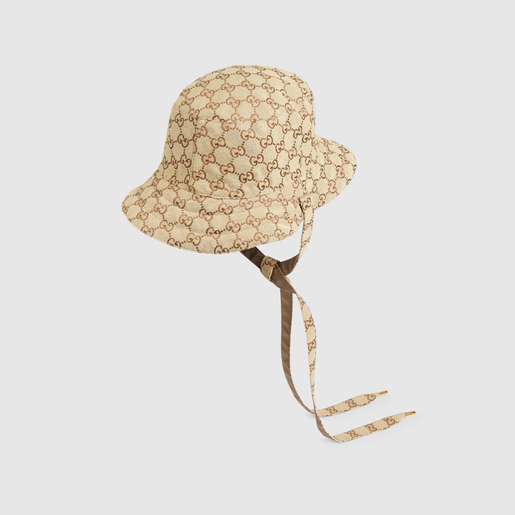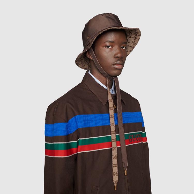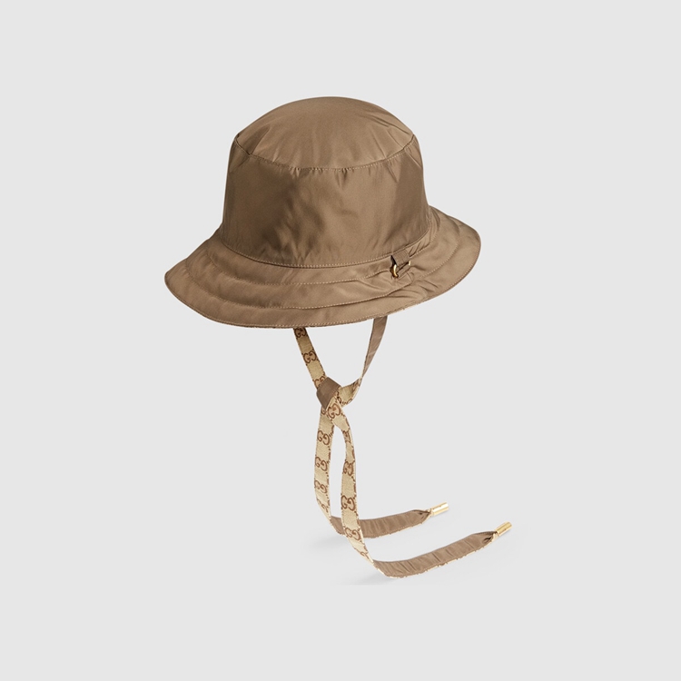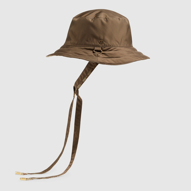 Style 626917 4HK78 2565 The bucket hat recalls The popular nineties shape, enriched With unexpected House details For Pre-Fall 2020. Crafted from brown nylon, it reverses to GG canvas. Long straps on either side can be left loose or tied around The neck. A small metal Double G appears on The side.