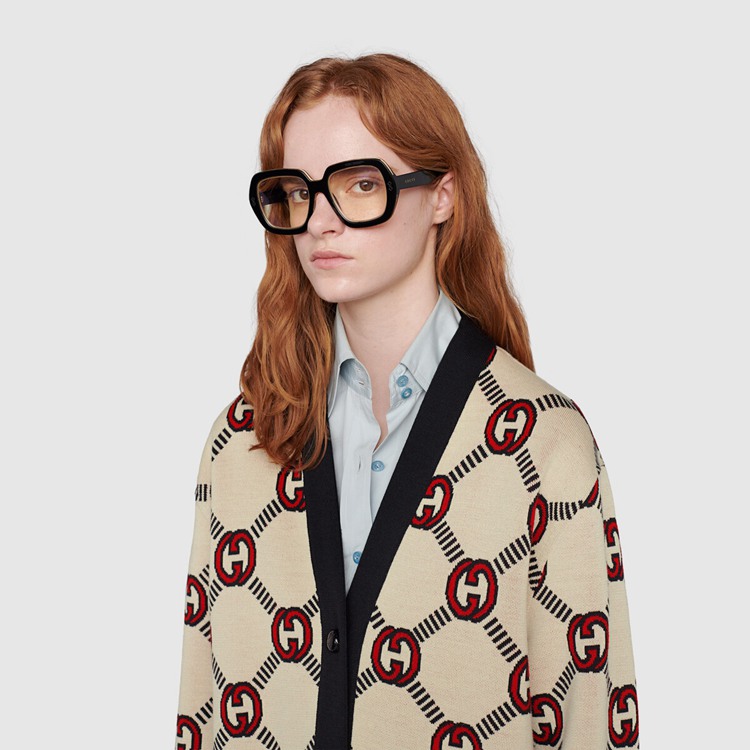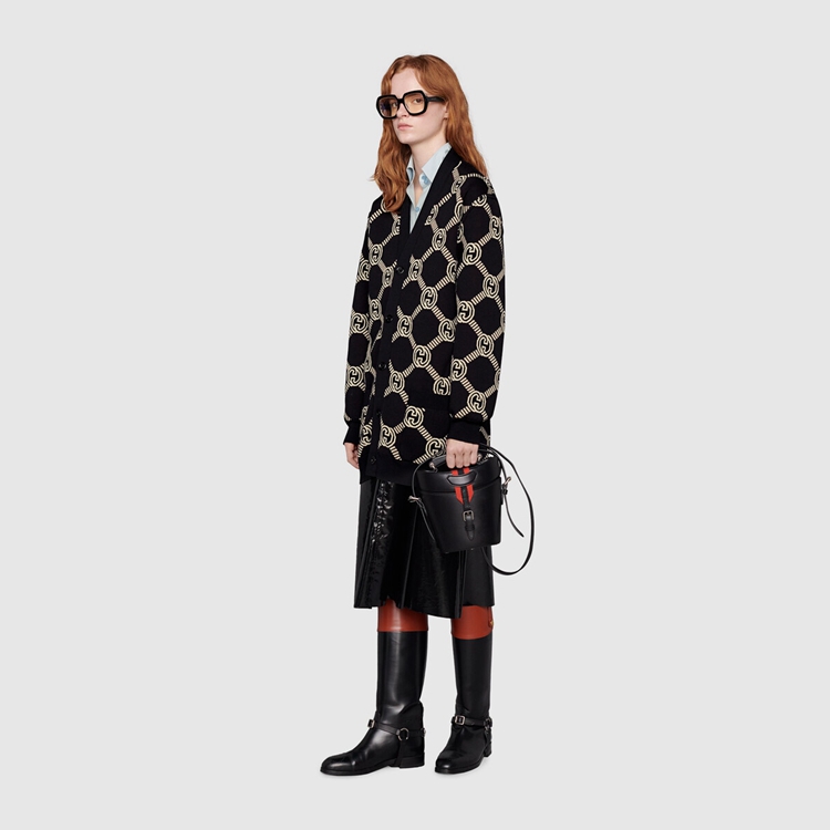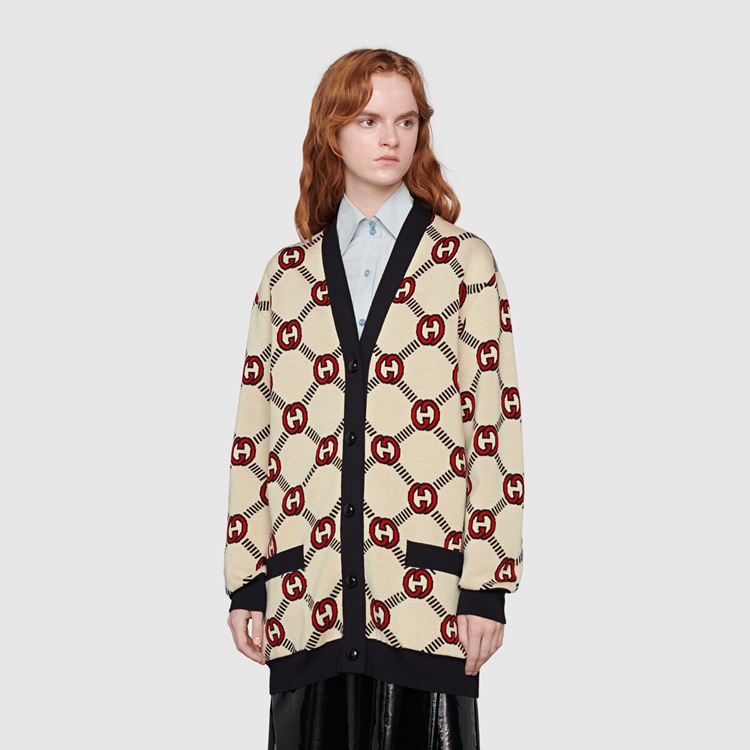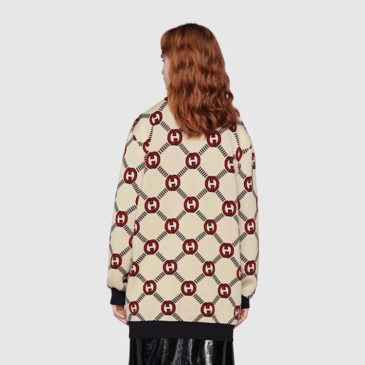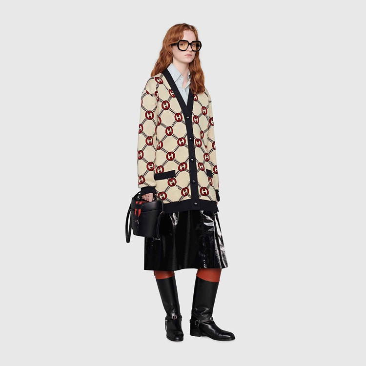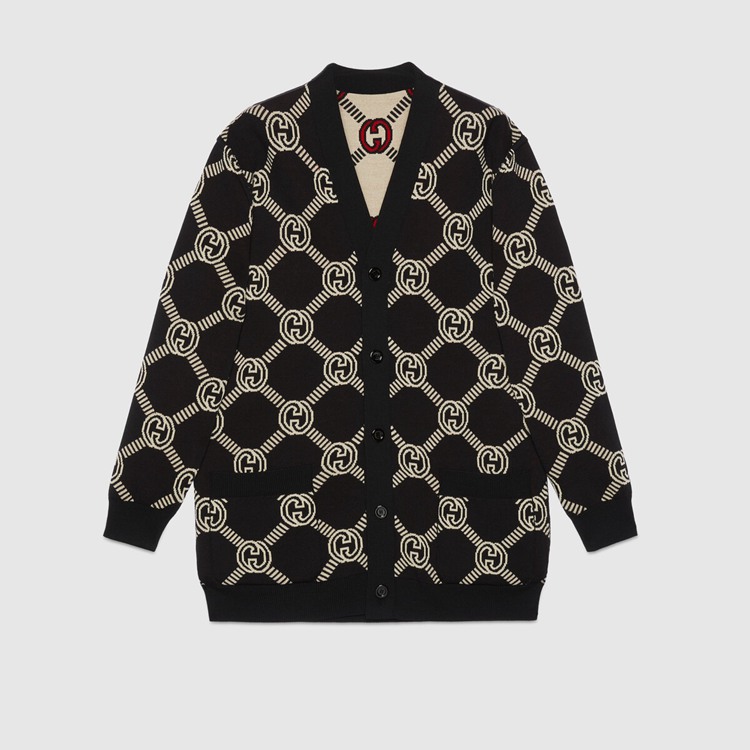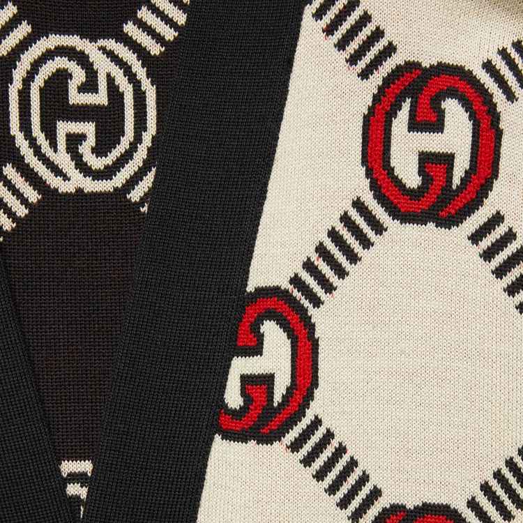 Style 678308 XKB7T 9194 The Interlocking G— One of The House’s most recognizable codes—take The shape of a jacquard motif. Crafted from wool, This cardigan is defined by a reversible construction and can be worn on The black and ivory side or The red and ivory one.