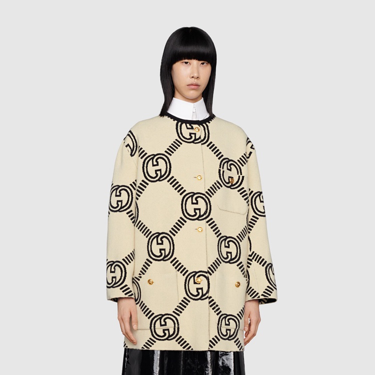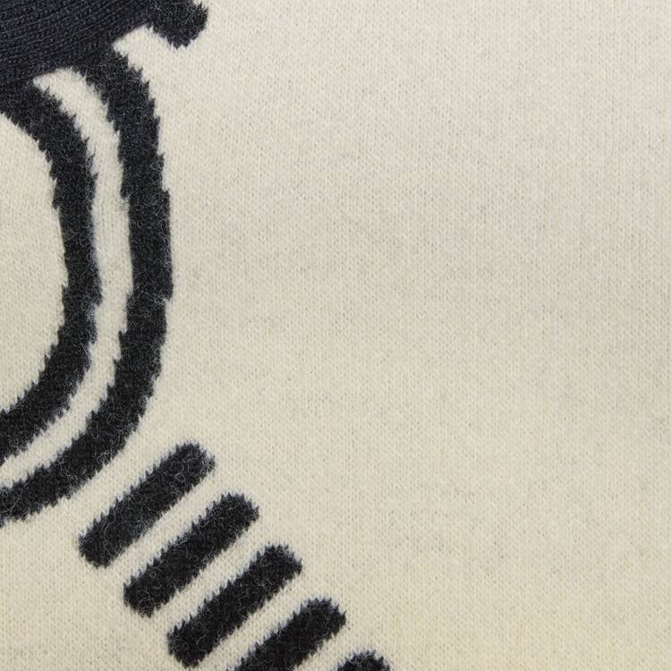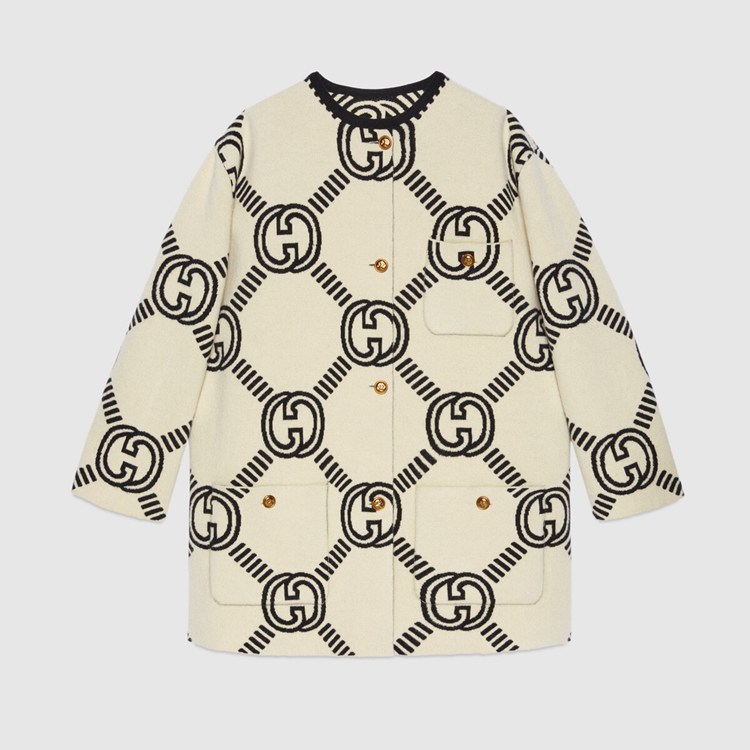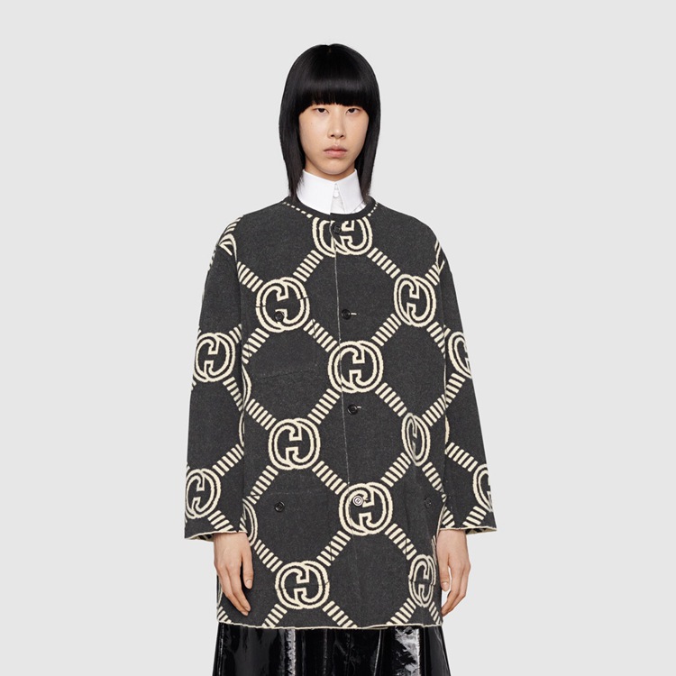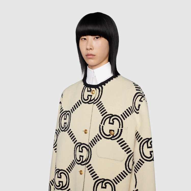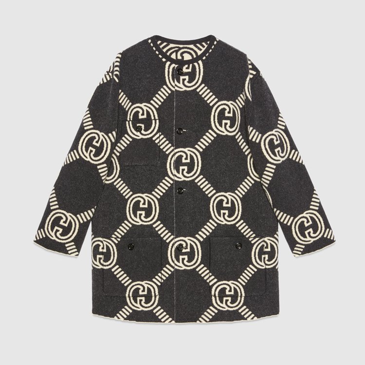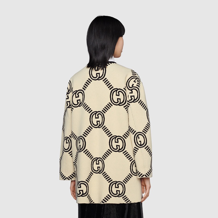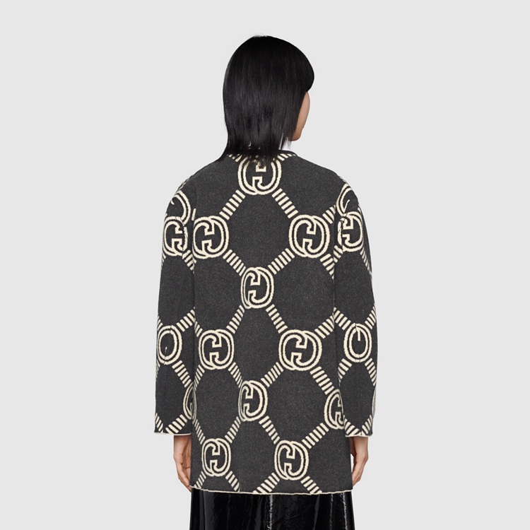 Style 678318 XKB5T 9192 The Interlocking G— One of The House’s most recognizable codes—take The shape of a jacquard motif. Crafted from wool, This cardigan is defined by a reversible construction that features a prevalent black side and a mostly ivory one.