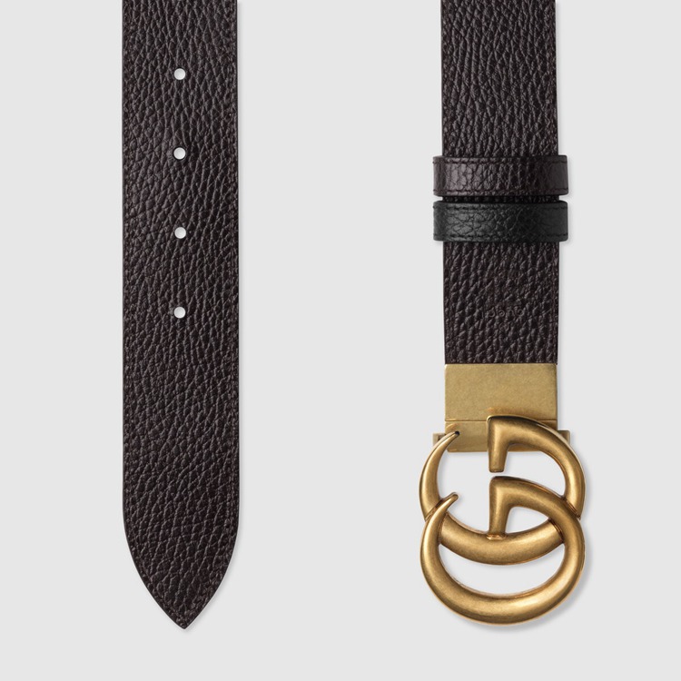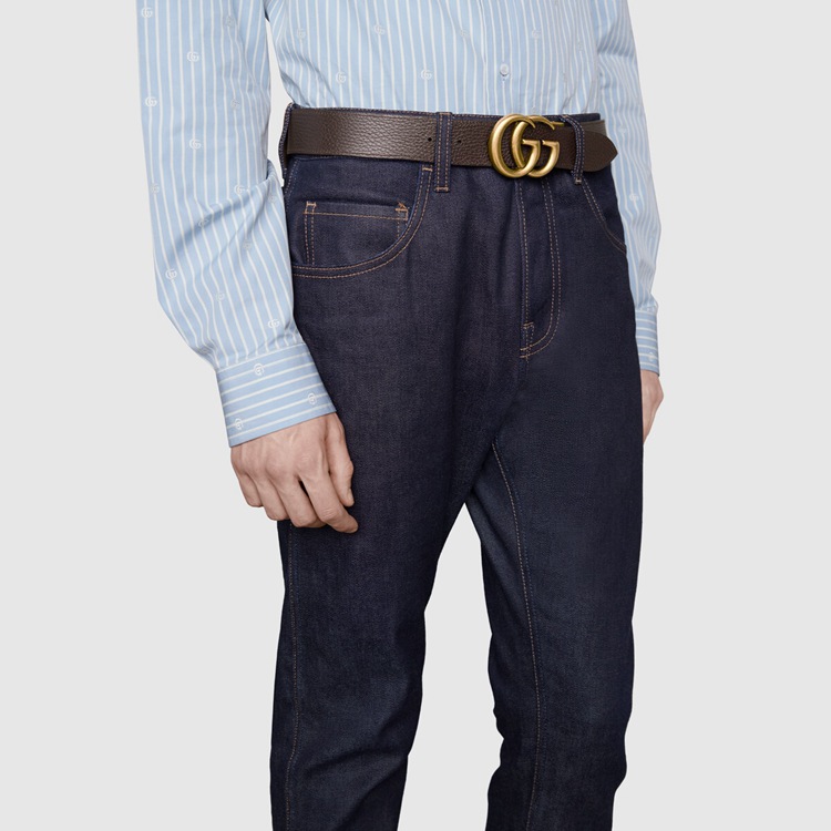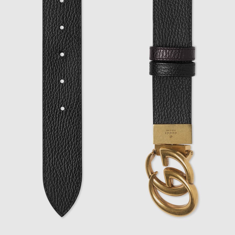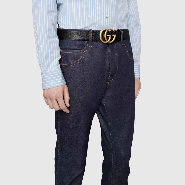 Style 627055 CAO2T 1062 A reversible leather belt in textured leather, finished With The Double G buckle. The hardware was Inspired by an archival design from The ’70s-a hallmark era of The House.