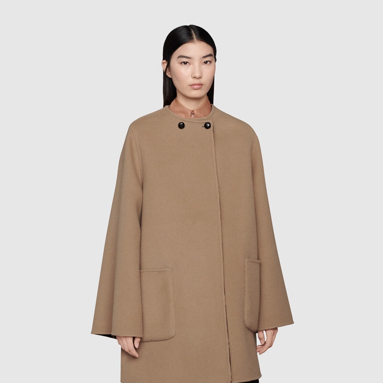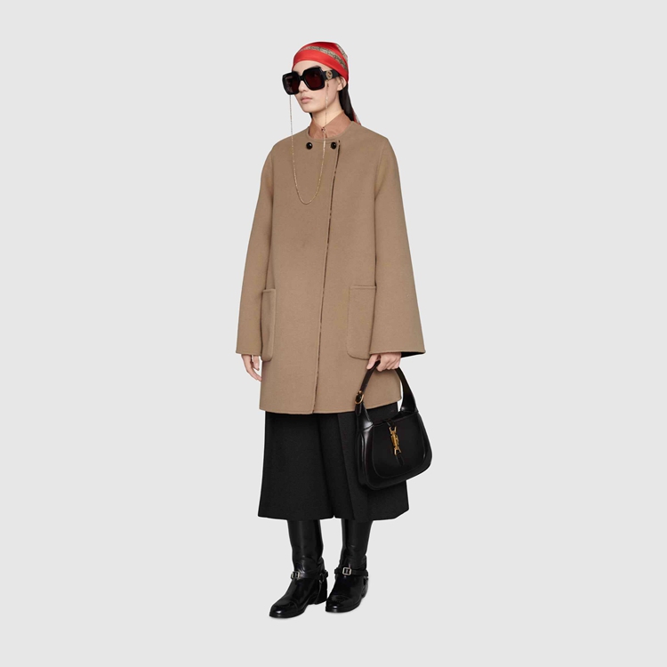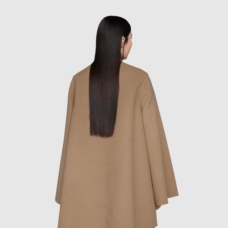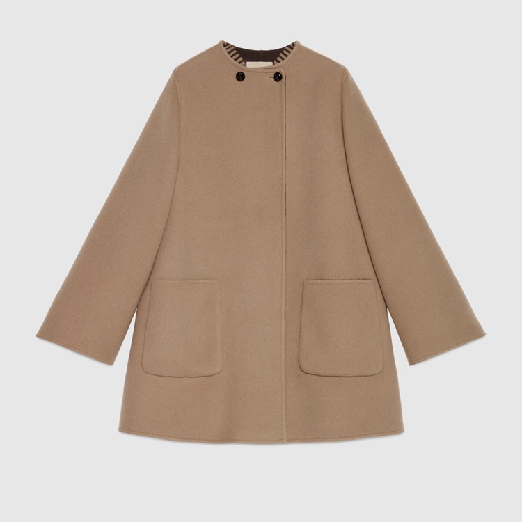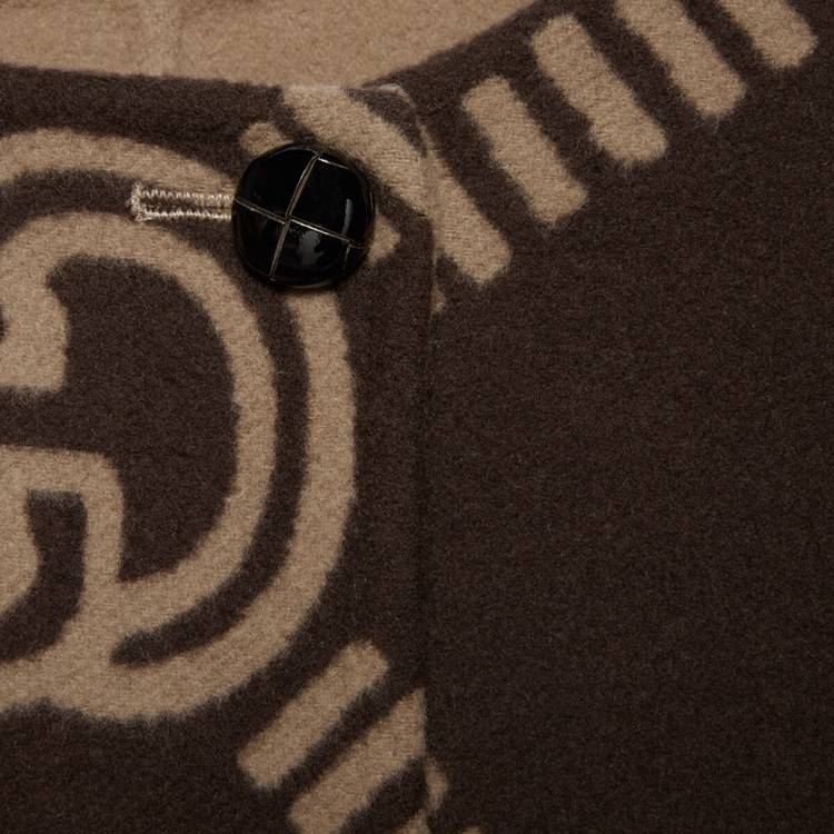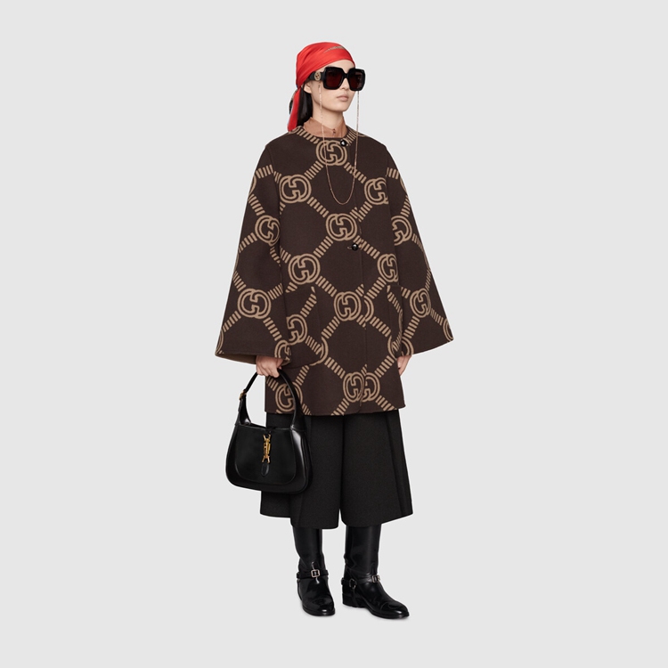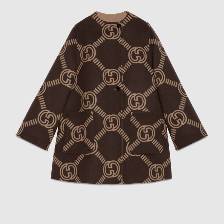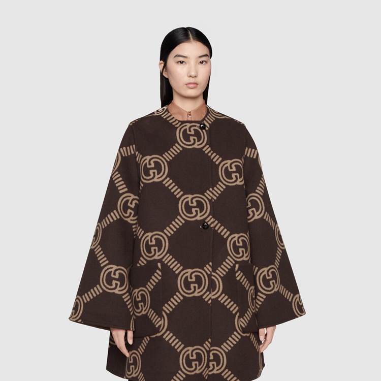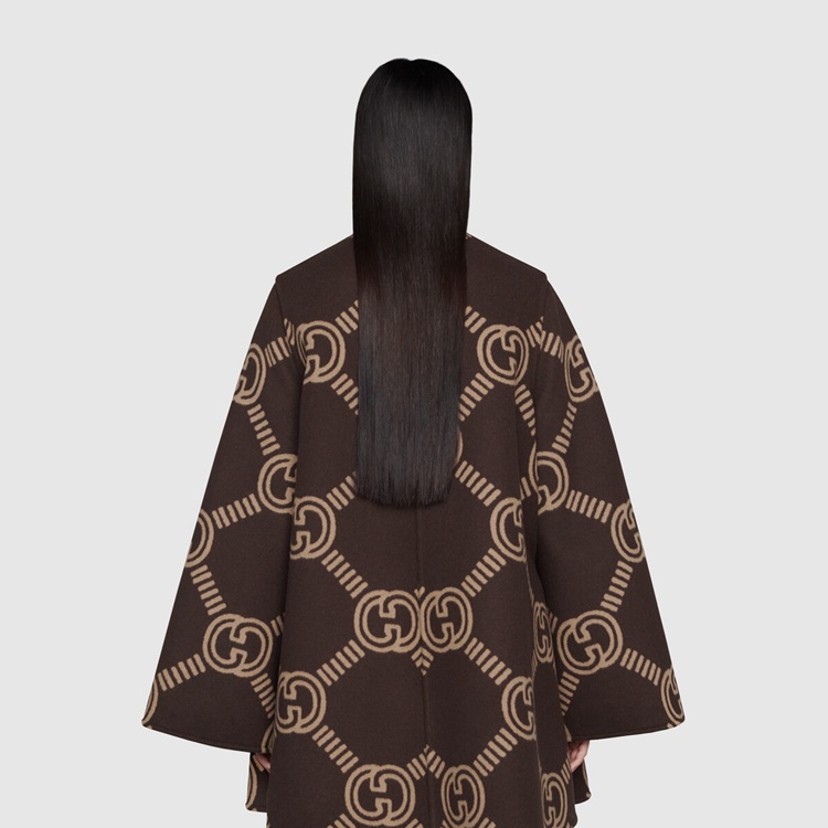 Style 681128 Z8AV0 2668 Crafted from brushed wool, This cape like coat reverses into an all over GG pattern. An established symbol of Gucci’s heritage, The GG logo is continually incorporated into collections in New ways With modern iterations that play With dimension, styling and design.