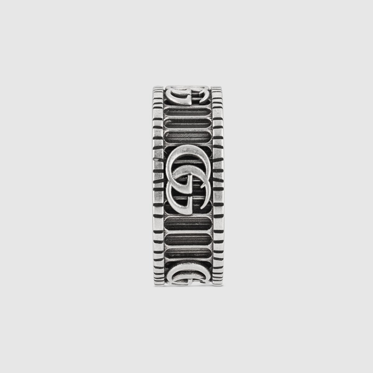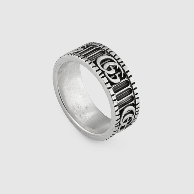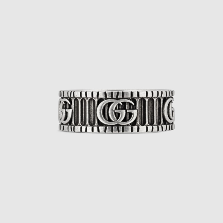 Style 551899 J8400 0811 The Double G continues to define House designs. A contemporary take on an archival Gucci belt from The ’70s, The distinctive symbol is combined With engraved patterns on a collection of silver jewelry. Set against a three-dimensional striped design With a bi Color effect, The Emblematic code brings dimension to a thin ring.