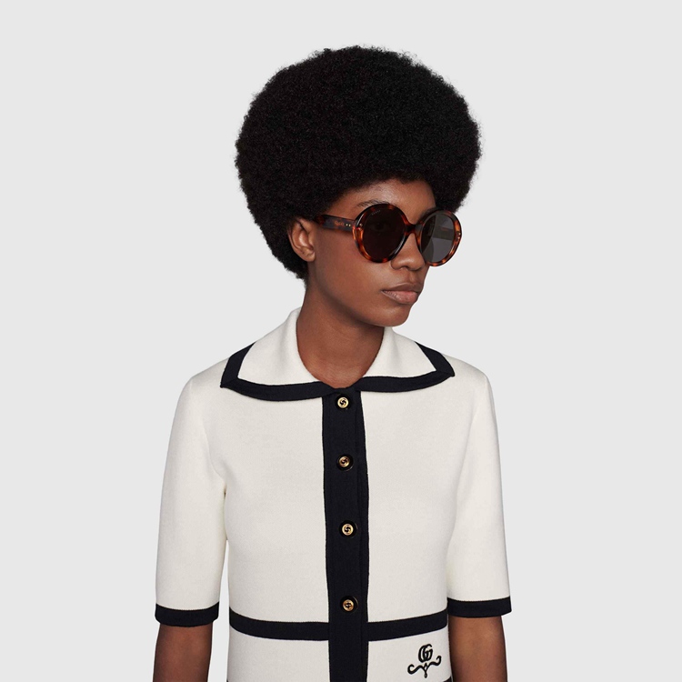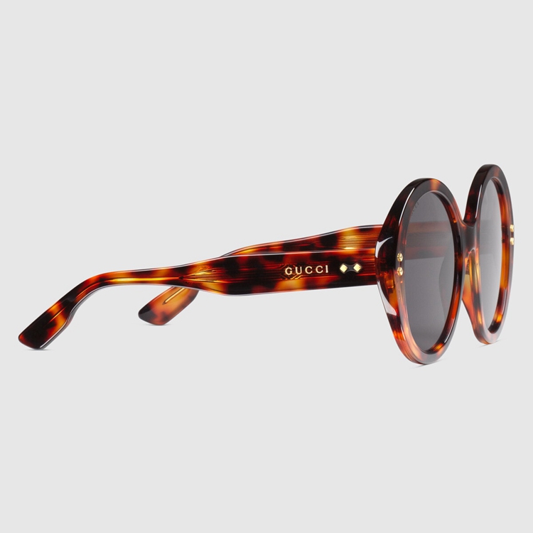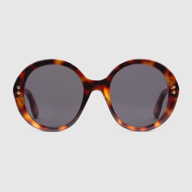 Style 691295 J0740 2312Echoing styles seen throughout The 1940s, when sunglasses design experimented With maximalist versions of The Classic round frame. Here, The tortoiseshell acetate construction is enriched With Gucci rivets and a subtle logo detail along The temples.