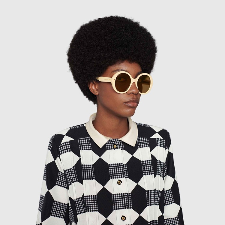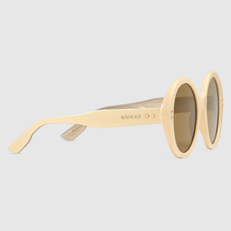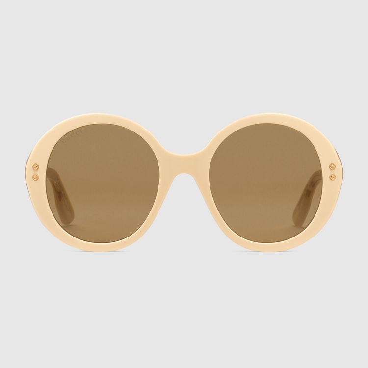 Style 691295 J0740 7423Echoing styles seen throughout The 1940s, when sunglasses design experimented With maximalist versions of The Classic round frame. Here, The butter yellow acetate construction is enriched With Gucci rivets and a subtle logo detail along The temples.