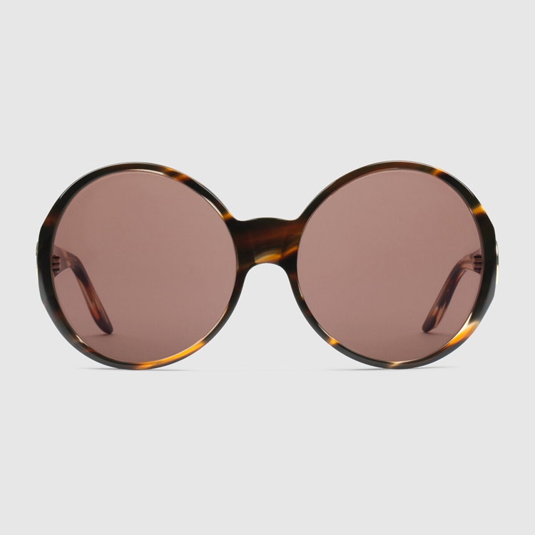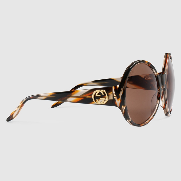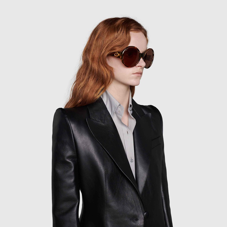 Style 691287 J0740 2323Classic, round-frame sunglasses, Crafted from tortoiseshell acetate. The tapered temples are decorated by an oversized Interlocking G. The emblem continues to be a distinguishing feature of Gucci’s collections, enriching styles With a distinct logo feel.