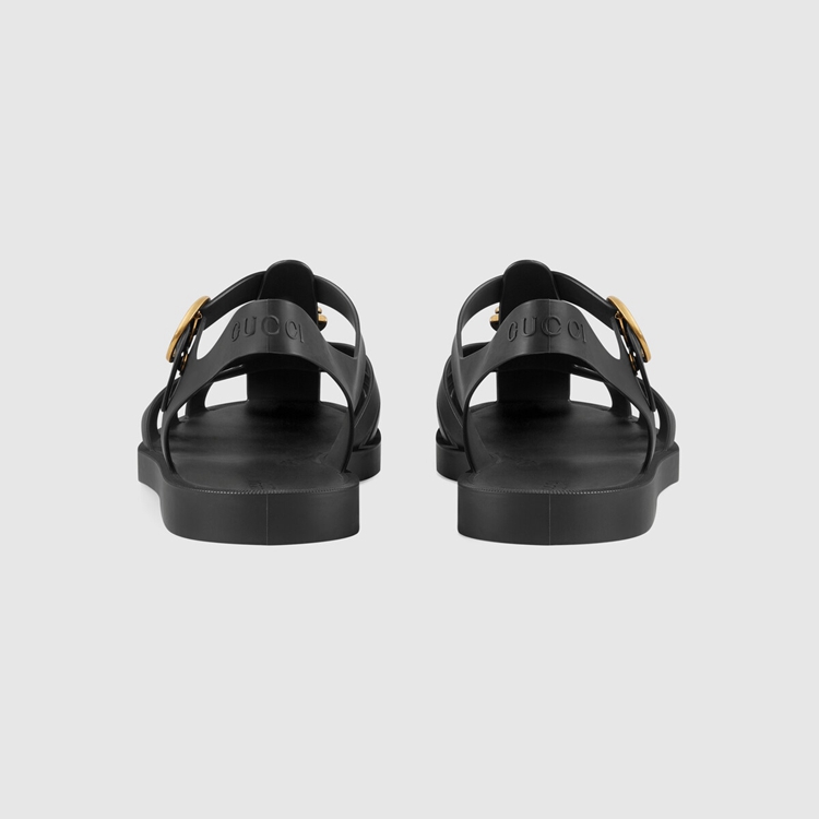 Style 463463 J8700 1000 A strap sandal in rubber is embellished With Double G hardware on One shoe and metal feline head on The other.