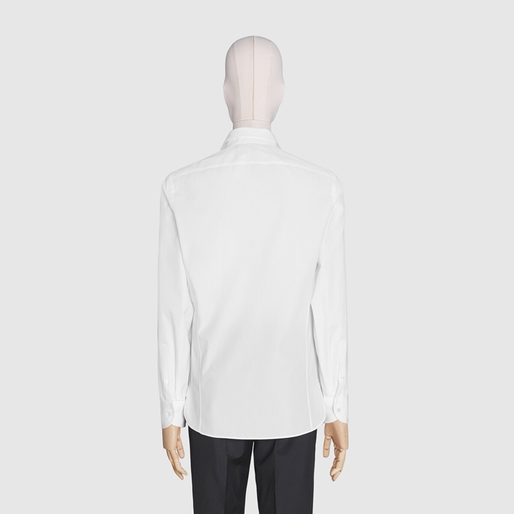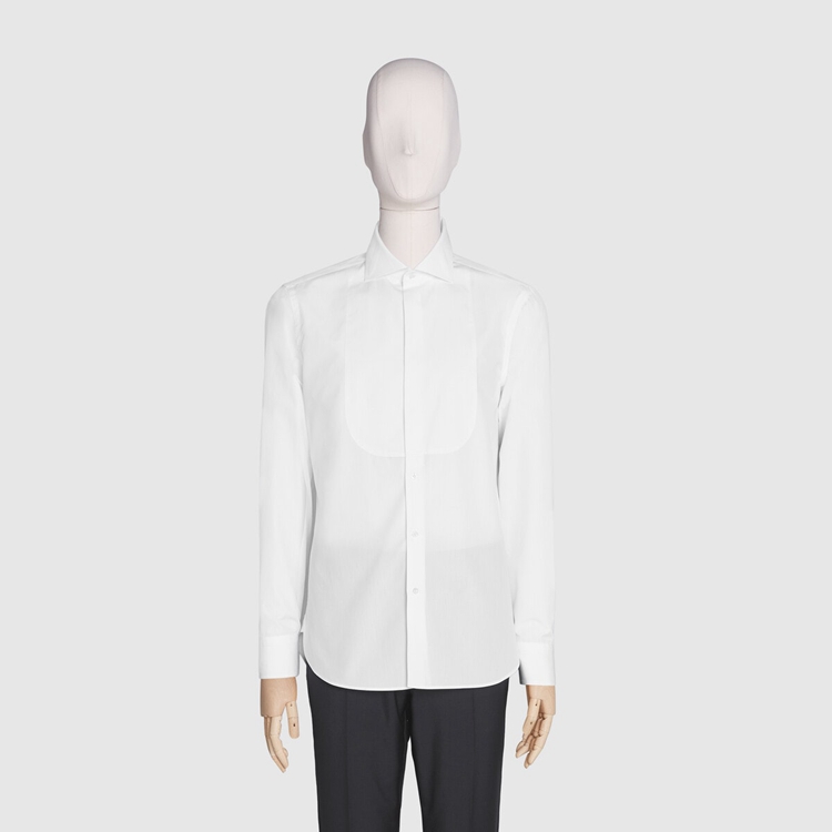 Style 630427 Z3854 9000 With a French collar and plastron detail, This shirt is presented in white Sea Island cotton—a fine quality fabric With long, silky fibers and a uniform texture. A sartorial Inspired detail is hidden underneath The closure: “ Gucci quelle qu’en soit la saison” label. Translating literally to ” Gucci whatever The season,” The phrase plays on The concept that Gucci can be worn at any time.