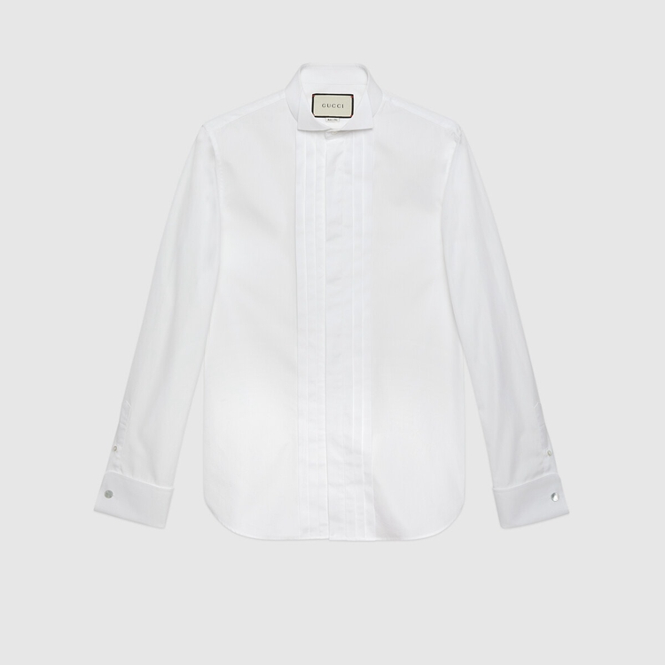 Style 625885 Z3854 9000 With a bow tie collar and front pleats, This shirt is presented in white Sea Island cotton—a fine quality fabric With long, silky fibers and a uniform texture. A sartorial Inspired detail is hidden underneath The closure: “ Gucci quelle qu’en soit la saison” label. Translating literally to ” Gucci whatever The season,” The phrase plays on The concept that Gucci can be worn at any time.