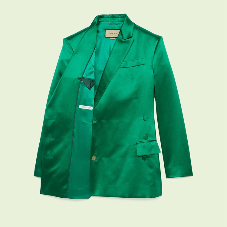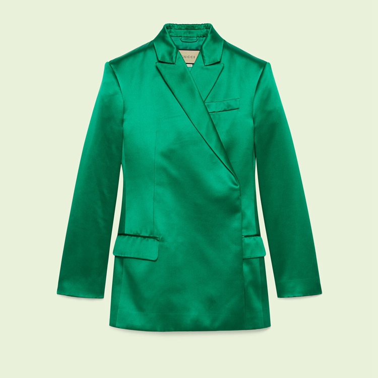 Style 686441 ZHS84 3435Socialites from The 1970s represent a strong source of inspiration For Alessandro Michele, resulting in a series of tailored looks. Crafted from emerald green silk duchess, This jacket has a wrap closure on The side, highlighting The Retro theme of The style.