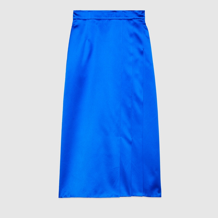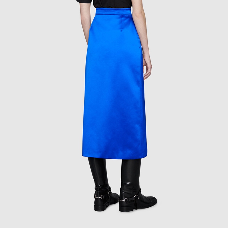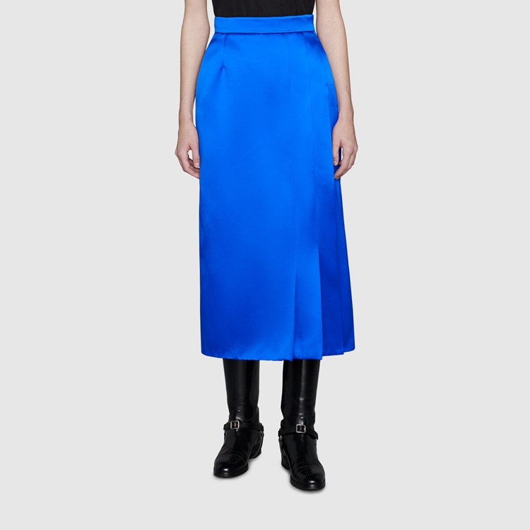Style 664421 ZHS84 4256 Color blocking pieces are presented For Gucci Aria through of bold Color combinations. Contrasting shades are paired together and further enhanced by textures and layers. This silk duchesse skirt is presented in a bright blue color.