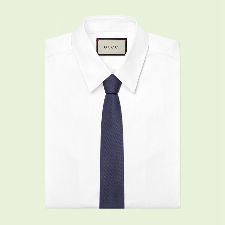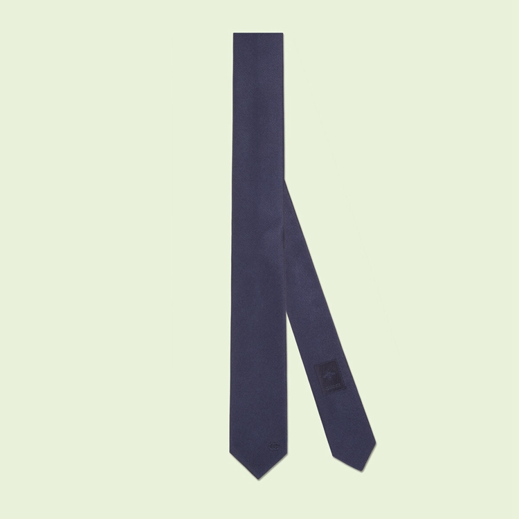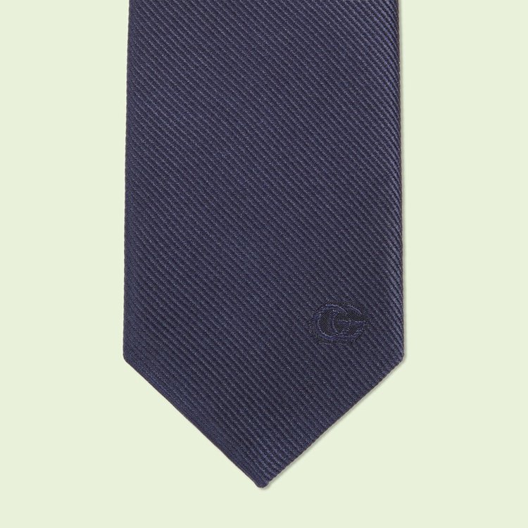 Style 707253 4NAAB 4000 Emblematic motifs synonymous With The House enrich silk accessories, continuing The narrative seen in The ready-to-wear collection. This dark blue silk tie is decorated With The unmissable Double G emblem, appearing as a subtle detail at One corner.