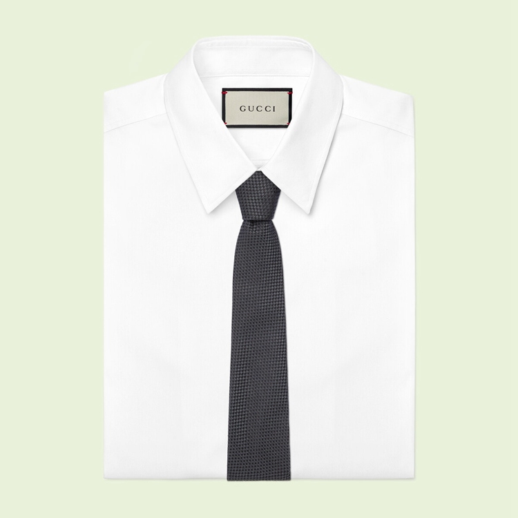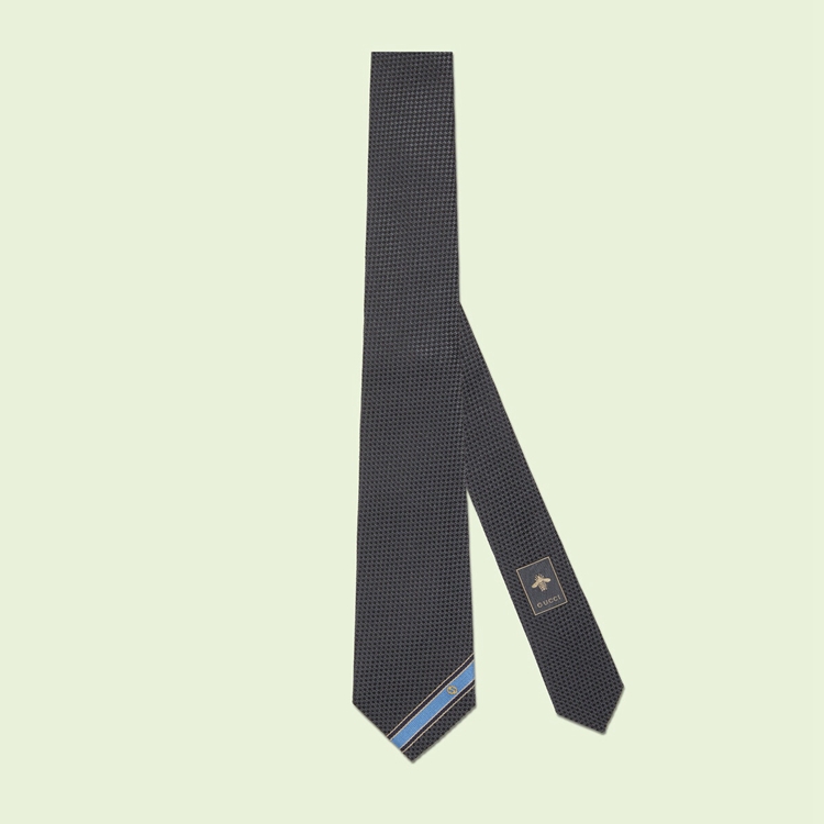 Style 643945 4E002 4069 One of The House’s most recognizable codes, The Interlocking G is representative of Founder Guccio Gucci’s initials and is continually reintroduced season after season. Here The motif appears as a subtle nod atop This silk jacquard tie as Part of a light blue stripe detail.