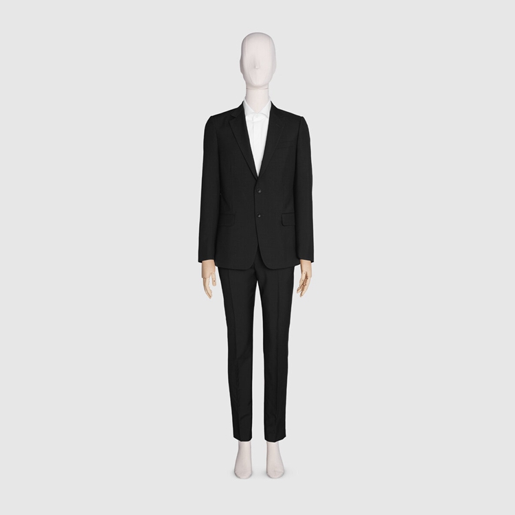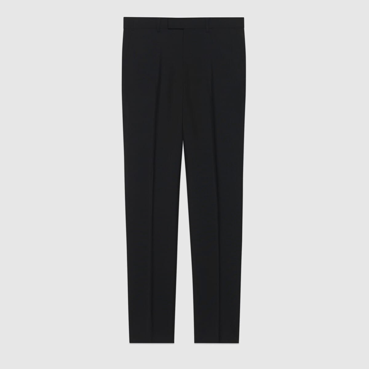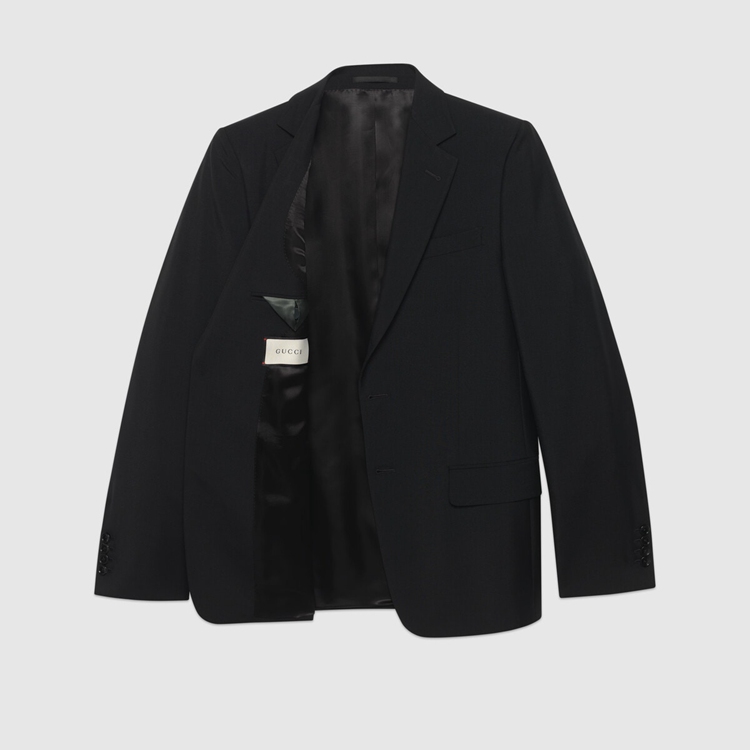 Style 630137 Z596D 1000 A sartorial design introduced For The Pre-Fall 2020, This suit features a single-breasted jacket With notch lapel and coordinating pants in black wool mohair. Part of a streamlined aesthetic that instills a contemporary spirit into Classic Designs and fabrics, Gucci explores a New approach to tailoring.
