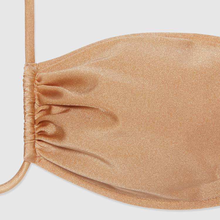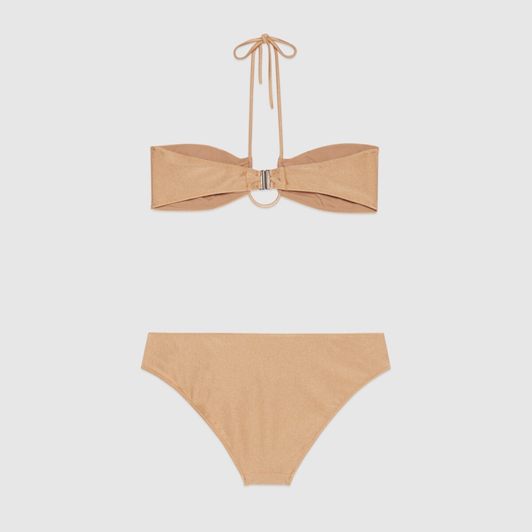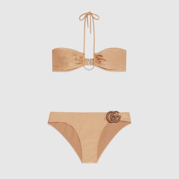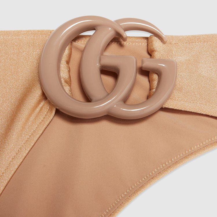 Style 665718 XHAD9 9816An archival reprisal from The ’70s, The Double G hardware enriches This two-piece bikini Crafted from dark beige sparkling jersey. The logo is reinterpreted in different versions in each collection, bringing back symbols from The archive, re-envisioned in contemporary ways.