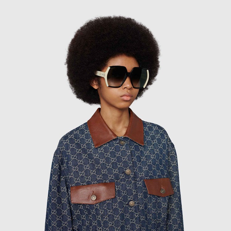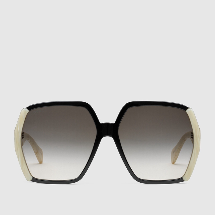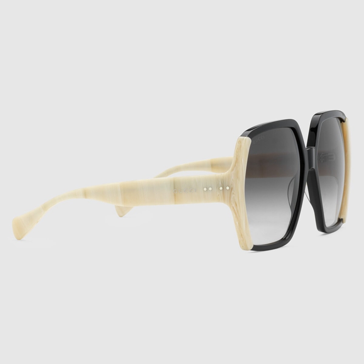 Style 681905 J0740 1912 Taking inspiration from ’70s styles and shapes, These rectangular-frame sunglasses are defined by thick profiles and contrasting colorways. Crafted from acetate, The contrasting black and beige frame adds a distinctive design element. A gradient grey lens completes The style With a contemporary touch.