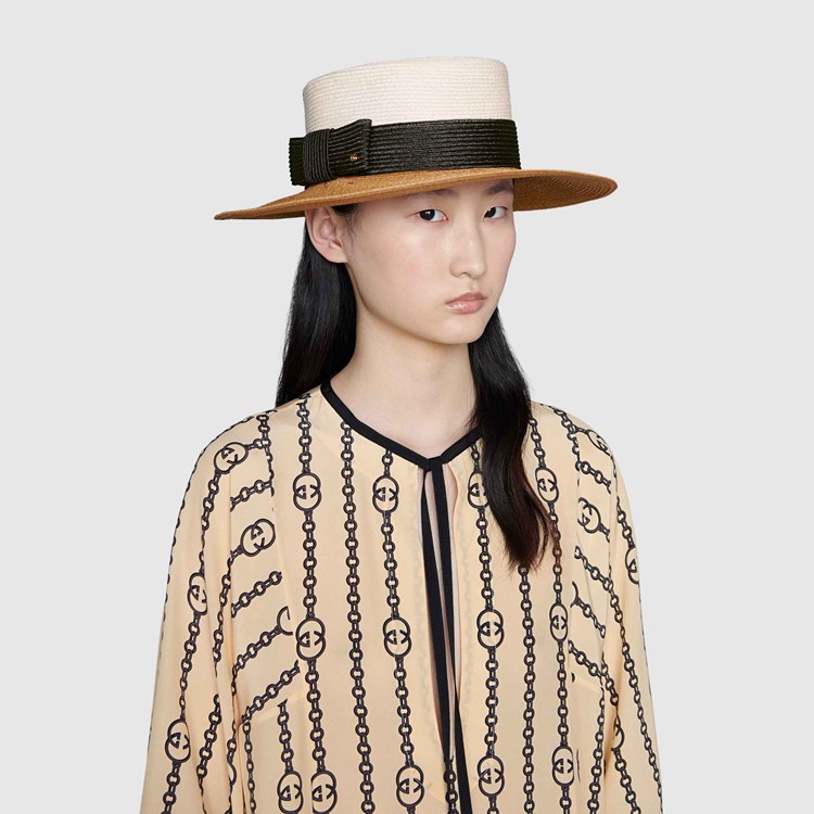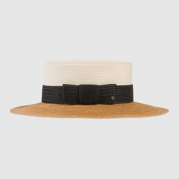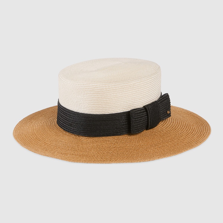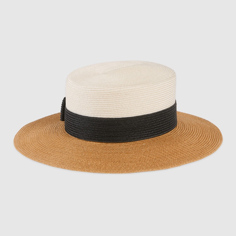 Style 454667 3HADD 9060Conveying The Gucci’s idea of timeless style that transcends The changing seasons and leaves all rules behind is a white and black wide-brimmed hat With straw effect fabric.