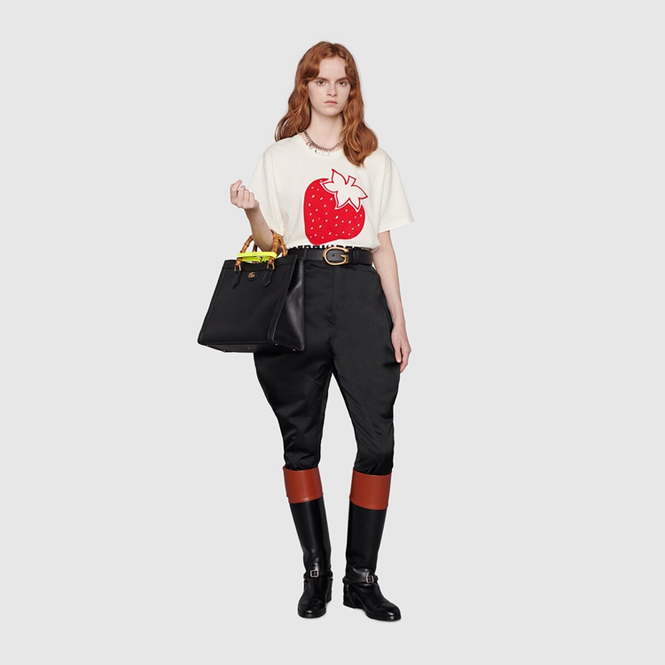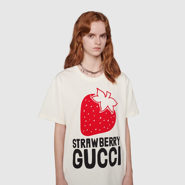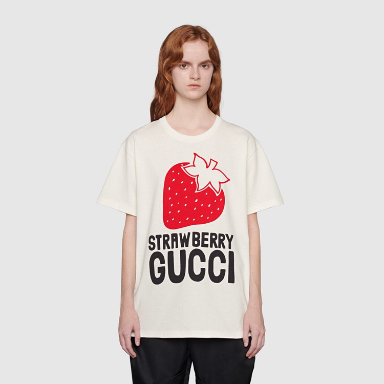 Style 615044 XJDZU 9095 Part of The Gucci references to pop culture, fruits in all shapes and forms continues to enrich The House’s narrative. For Aria, they appear as playful prints, often enriching a selection of ready-to-wear pieces. This off-white cotton T-shirt is animated by a ‘Strawberry Gucci’ print.