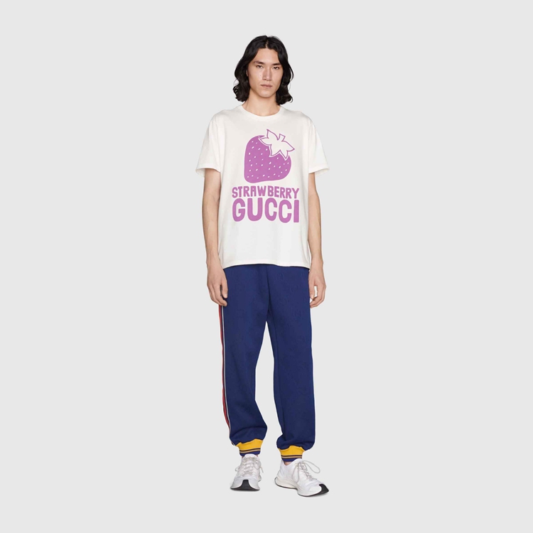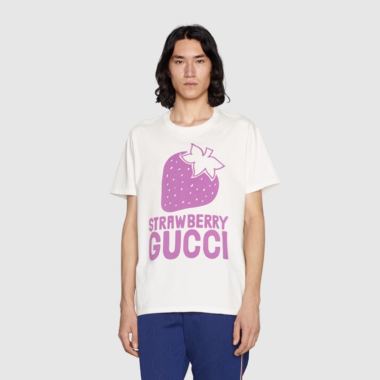 Style 548334 XJDWG 9275 Part of The Gucci references to pop culture, fruits in all shapes and forms continues to enrich The House’s narrative. For Aria, they appear as playful prints, often enriching a selection of ready-to-wear pieces. This white cotton T-shirt is animated by a ‘Strawberry Gucci’ print.