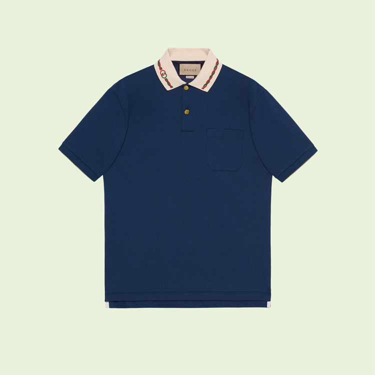 Style 692141 XJD69 4684Defined by its contrast collar and Classic fit, This dark blue stretch cotton piquet polo draws upon Gucci’s history.